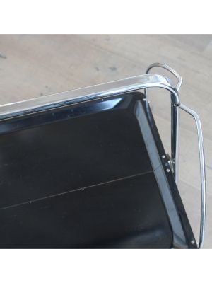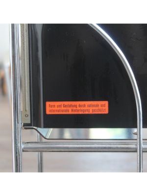 La struttura in acciaio cromato sostiene due ripiani in formica nera. Il design minimal consente di ripiegarlo completamente o solo a metà, adattandosi facilmente a ogni esigenza di spazio. Una volta chiuso, diventa sottilissimo, tanto da poter essere riposto dietro una porta o in un angolo.