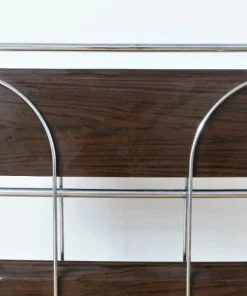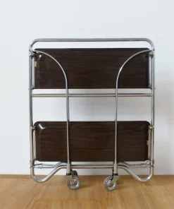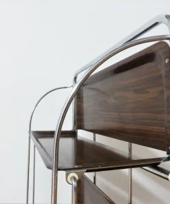 Design Vintage Carrello di servizio pieghevole 2 ripiani, in metallo colore marrone e argento Periodo del design e produzione 1970 – 1979 Anno Paese di produzione Germania Stile Vintage Stato Molto buono — l’oggetto vintage non ha difetti ma può mostrare lievi tracce di usura Restauro e condizioni dettagliate Leggera usura dovuta all’età e all’utilizzo, Leggeri segni di usura Materiale Metallo, Plastica Colore Marrone Larghezza 70 cm Profondità 41 cm Altezza 80 cm