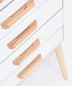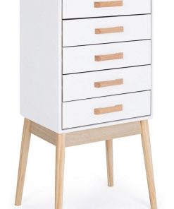 Cassettiera composta da 5 cassetti realizzati in legno colore bianco accompagnati da gambe slanciate dalla linea obliqua e dalla finitura naturale. Il bicolore bianco e naturale, fa si che questa cassettiera si adegui facilmente al tuo arredamento, rendendosi pratica per qualsiasi stanza.