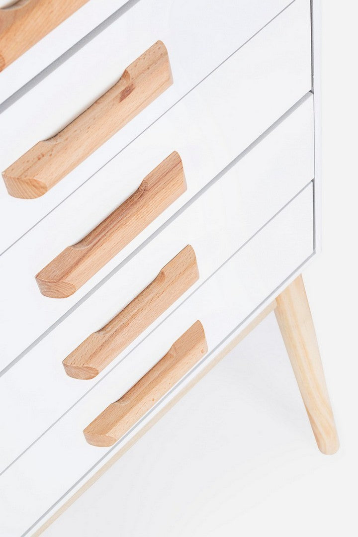 Cassettiera in legno con 5 cassetti, definita da un design sobrio distinto dalle gambe dalla linea obliqua e dal bicolore bianco e naturale. Una cassettiera come questa rappresenta la risposta versatile e multiuso per la tua casa.