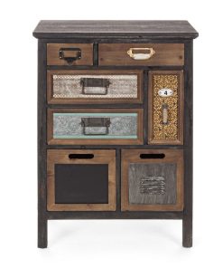Cassettiera in legno con 7 cassetti, dal design creativo che fa riferimento all’arredamento industriale. Questa cassettiera conquista per i frontali decorati in modo differente e fantasioso.