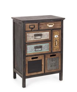 Cassettiera in legno con 7 cassetti, dal design creativo che fa riferimento all’arredamento industriale. Questa cassettiera conquista per i frontali decorati in modo differente e fantasioso.