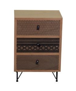 Cassettiera 3 cassetti con fantasie geometriche che decorano i frontali dei cassetti, realizzata in legno scuro e piedi in metallo nero.