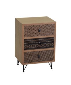 Cassettiera 3 cassetti con fantasie geometriche che decorano i frontali dei cassetti, realizzata in legno scuro e piedi in metallo nero.