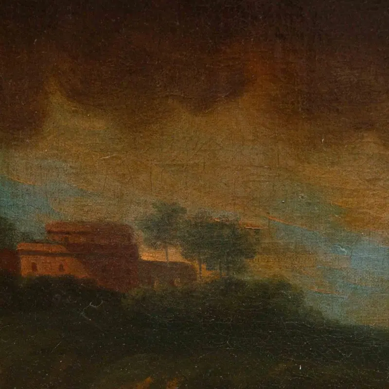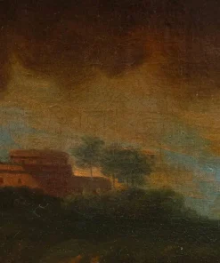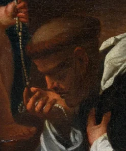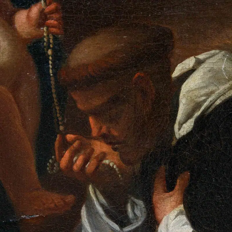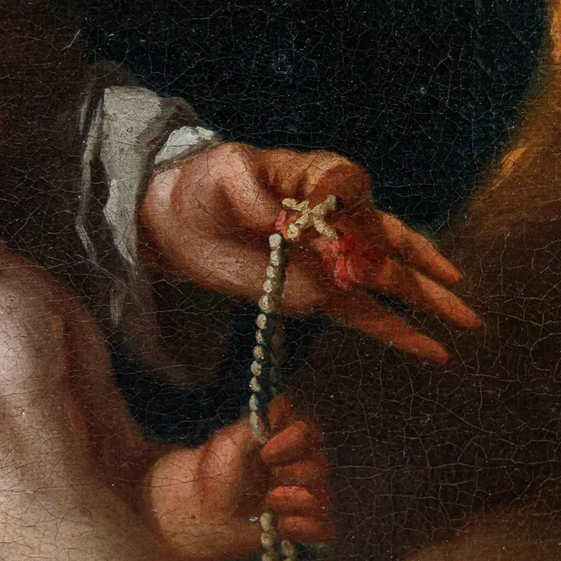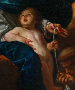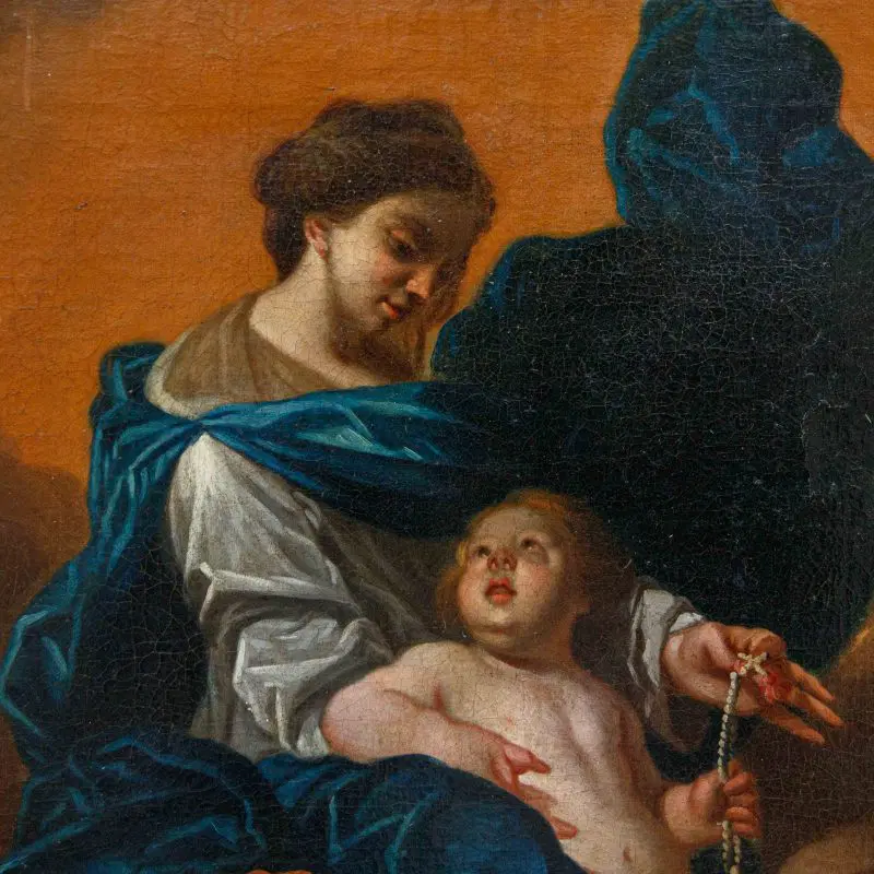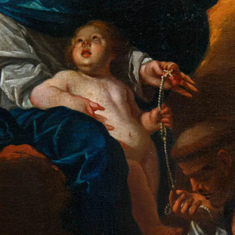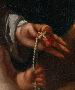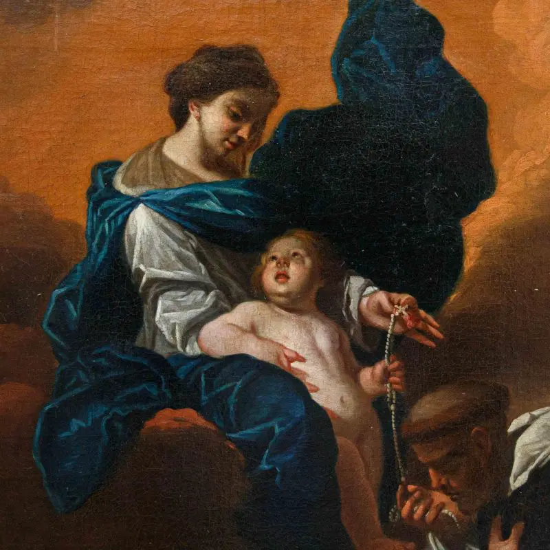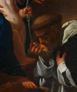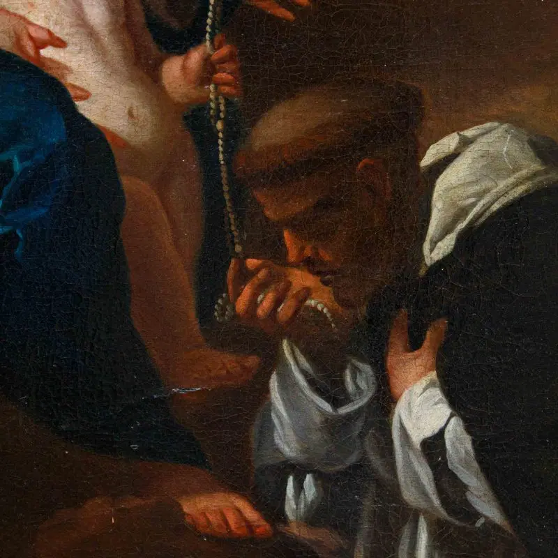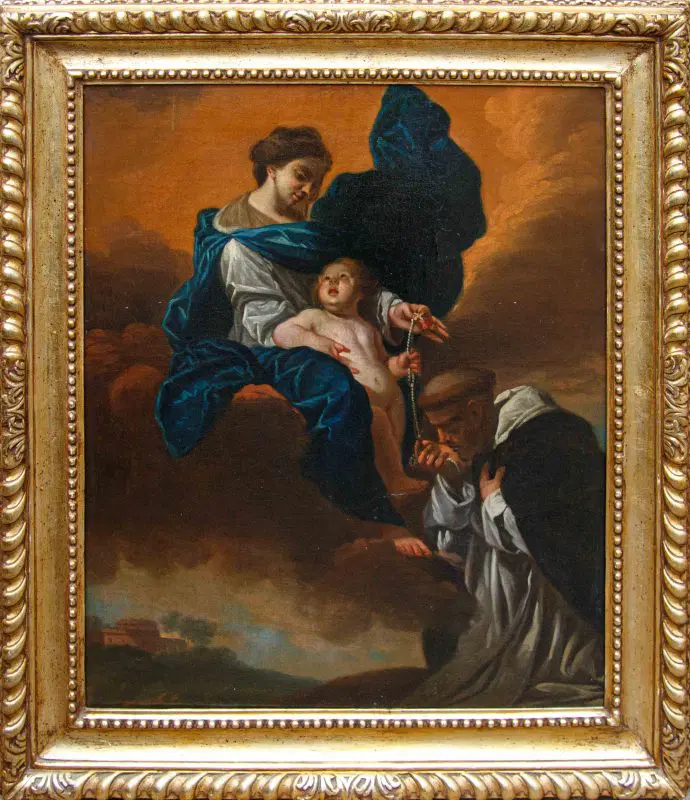 In questo bel dipinto seicentesco, ai piedi della Vergine e del Bambino è rappresentato San Domenico di Guzmán, fondatore del rigoroso ordine religioso dei domenicani particolarmente attivo nella lotta contro la diffusione delle eresie. Secondo ciò che riportano le sacre scritture, con particolare riferimento ai testi del domenicano Alano della Rupe, databili attorno al principio del XIII secolo, durante la sua peregrinazione volta alla diffusione della parola di Dio in tutta Europa, San Domenico fu rapito da una ciurma di pirati che lo condussero con loro su una nave il cui viaggio in mare aperto era messo in pericolo da un’improvvisa burrasca: in questo frangente, la Vergine si manifestò a Domenico, indicandogli il Santo Rosario come unica salvezza dal naufragio e dalla morte di tutti loro. Il Santo comunicò ai pirati quel monito, essi accettarono, e subito la furia del mare si placò. I pirati furono i primi membri Confraternita del Rosario, la dimora di Maria Vergine sulla terra. Per volontà della Madonna, il Rosario non era più solo uno strumento di salvezza personale, ma un’arma di preghiera comunitaria. A partire dal Basso Medioevo, infatti, la devozione del santo rosario, percepito come strumento di preghiera collettiva e come prezioso antidoto al dilagare delle eresie, si diffonde assai rapidamente per quanto concerne il panorama della cristianità occidentale. Tra il XVI ed il XVII secolo, sono moltissimi gli artisti che scelgono di rappresentare nelle proprie opere il momento in cui la Madonna elargisce il rosario al fondatore dell’ordine dei domenicani: ci basti pensare alla celeberrima Madonna del Rosario eseguita da Lorenzo Lotto per il palazzo comunale di Cingoli oppure alla Madonna con il Bambino e San Domenico di Ludovico Carracci della Pinacoteca Nazionale di Bologna.