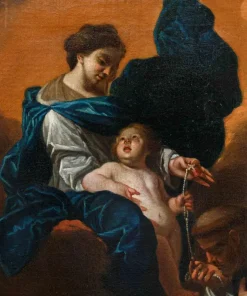 Questo dipinto dai colori vividi e dalla composizione dinamica e vorticosa potrebbe essere ascritto ad un membro della cerchia del celebre artista genovese Domenico Piola (1627-1703): da Piola, il pittore in questione pare ereditare vari espedienti sia tecnici che iconografici: le dolci fattezze del Bambino ricordano quelle del capannello di putti del Bacchino e Satiri del museo dell’Accademia Ligustica di Genova mentre la composizione ascensionale del dipinto pare rimandare direttamente a quella della Madonna e San Simone Stok della chiesa di San Pietro di Savona o a quella della Madonna con Gesù Bambino e San Gaetano di Thiene della chiesa genovese di San Giorgio. Il rapporto di commovente intimità e complicità tra la Vergine e il bambino è un dato che accomuna questo dipinto a molti dei più celebri brani della produzione di Domenico Piola: ci basti pensare alla Madonna con il Bambino e i Santi Francesco e Chiara di Palazzo Bianco a Genova