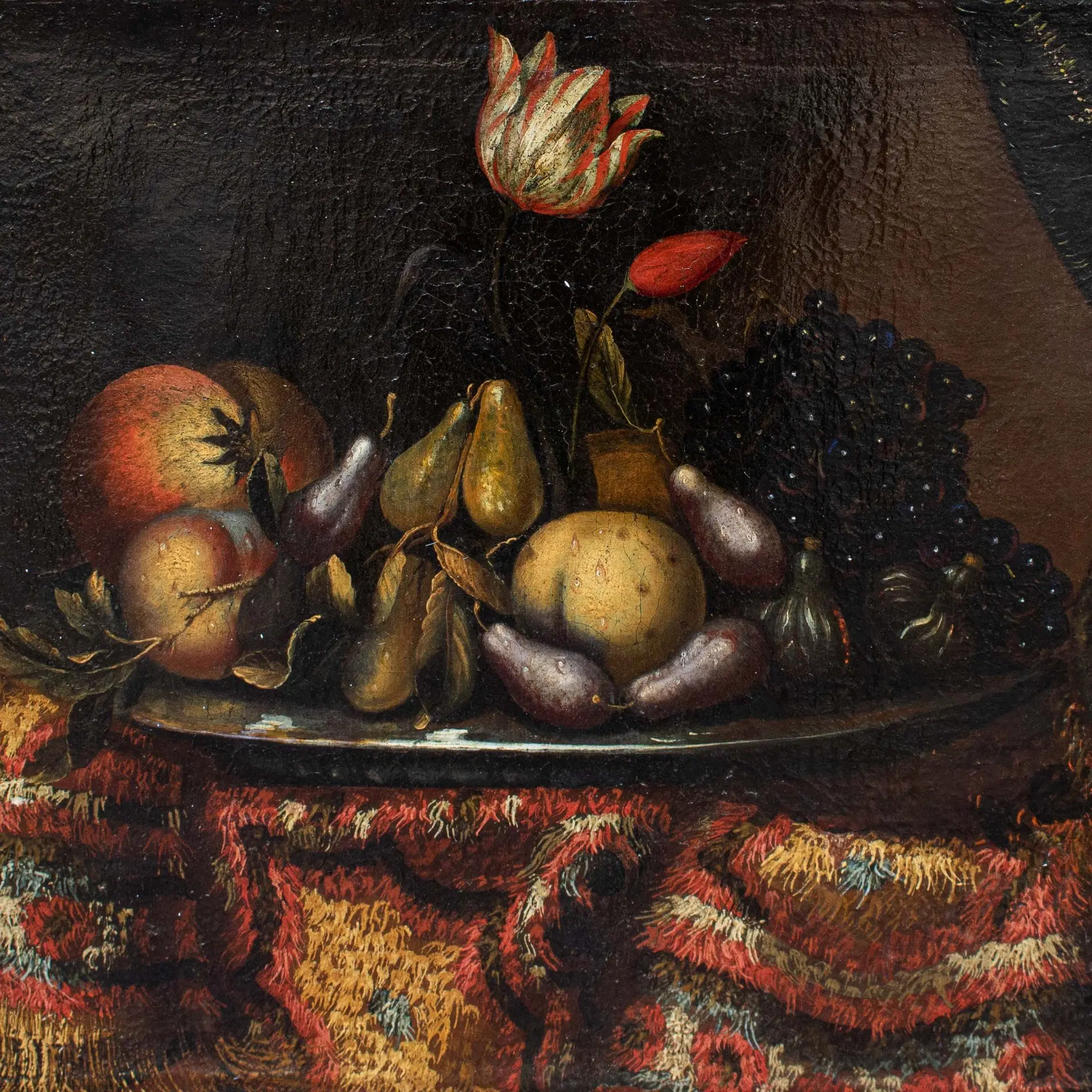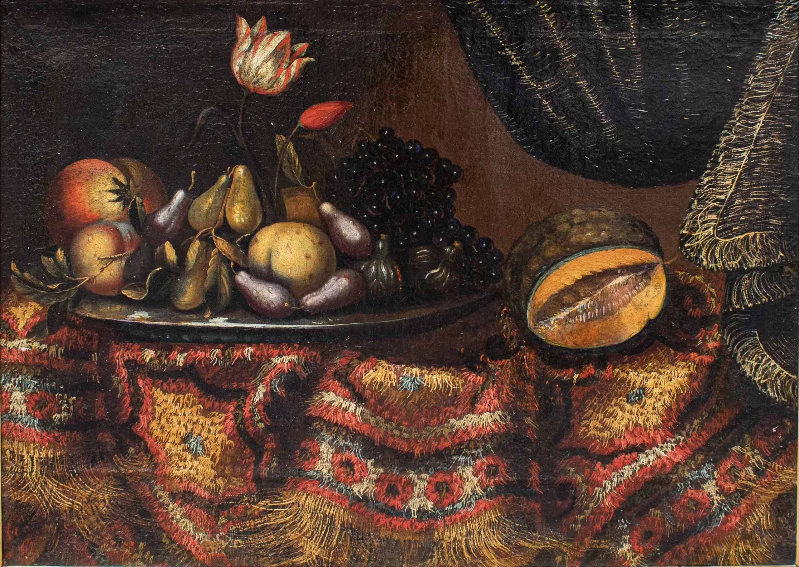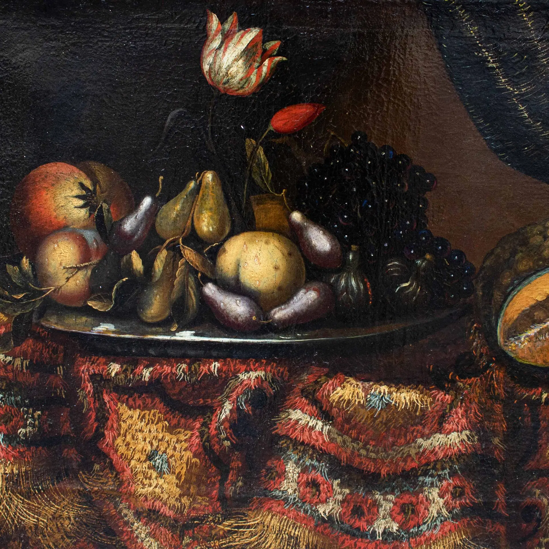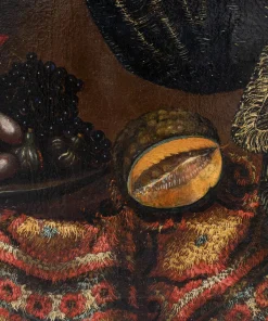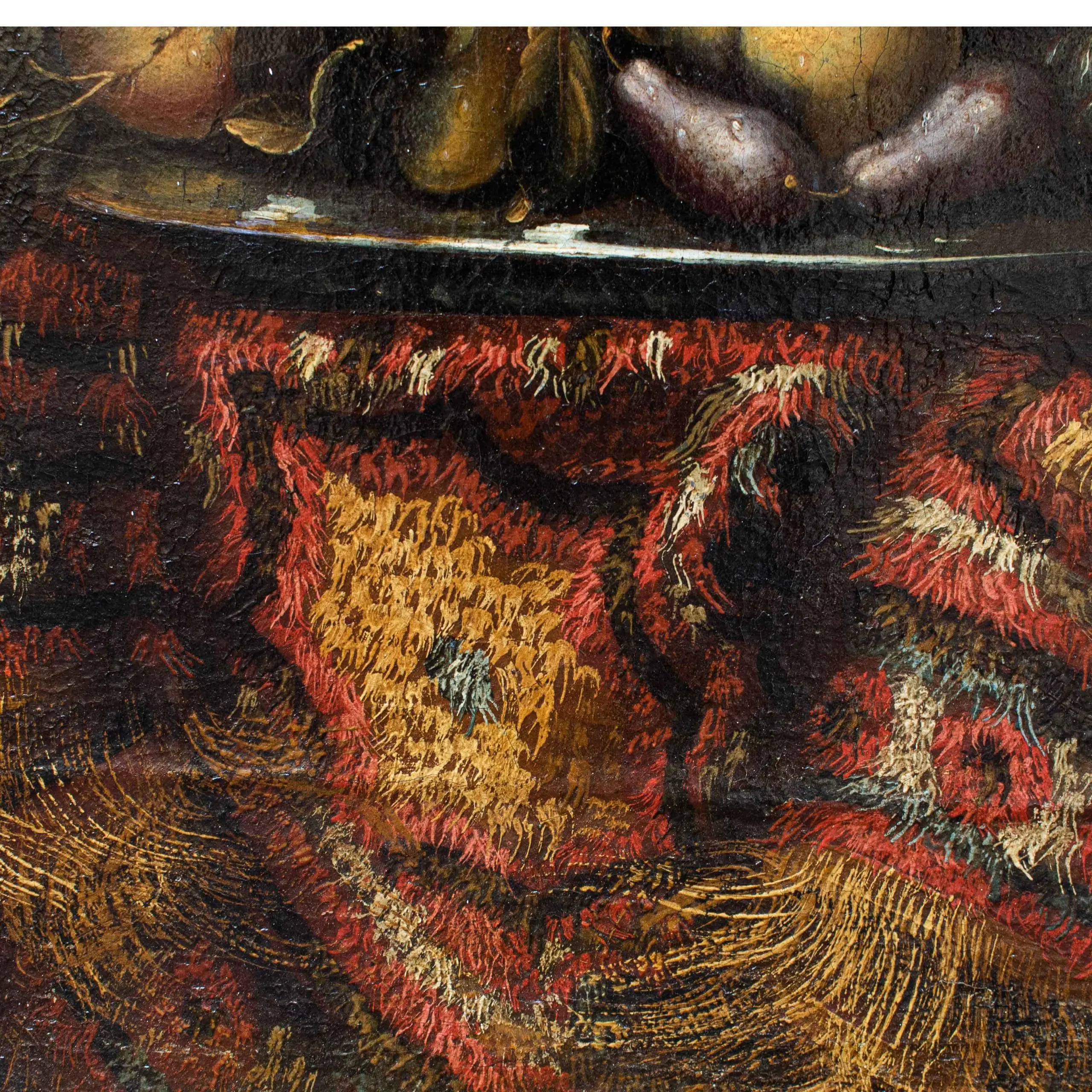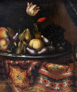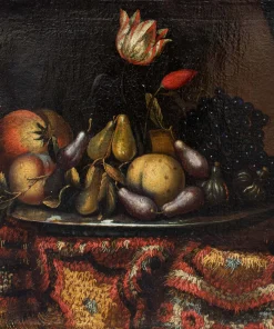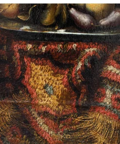 L’esuberanza dei colori sgargianti del tappeto, utilizzato quale preziosa tavola per il piatto argenteo base dell’ordinata serie di profumati frutti maturi, collima con la consistenza del tendaggio raccolto sull’angolo destro del dipinto. La minuziosità con cui l’artista ha saputo rendere l’interminabile susseguirsi di punti, nodi e frange del tappeto consente di ricondurne l’identità alla scuola di un pioniere del naturamorfismo impreziosito da questa specie di tessuti, ovvero francesco Noletti detto il Maltese.