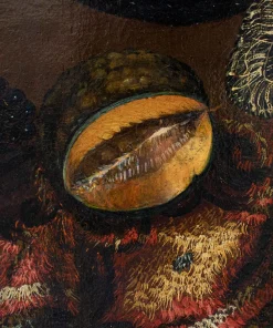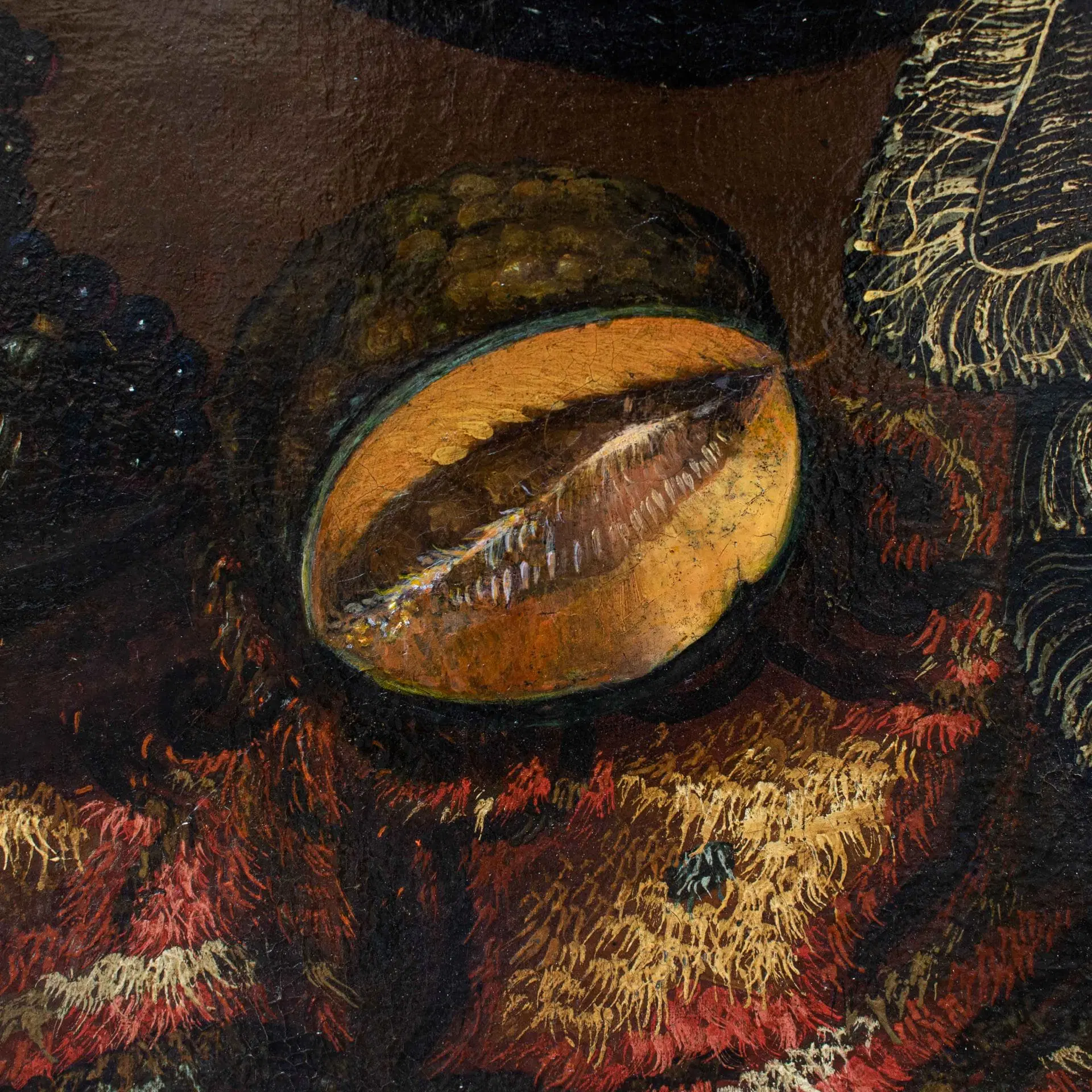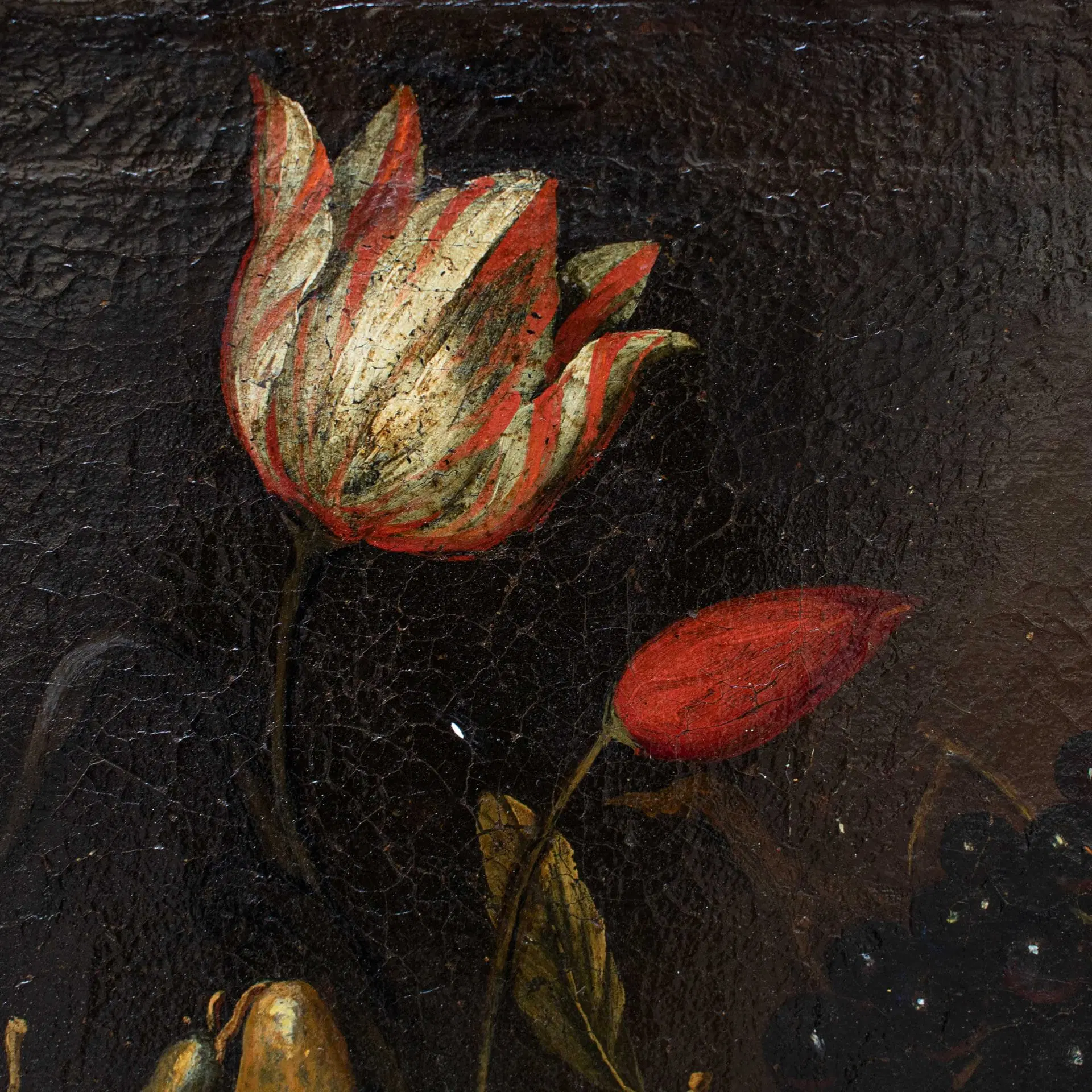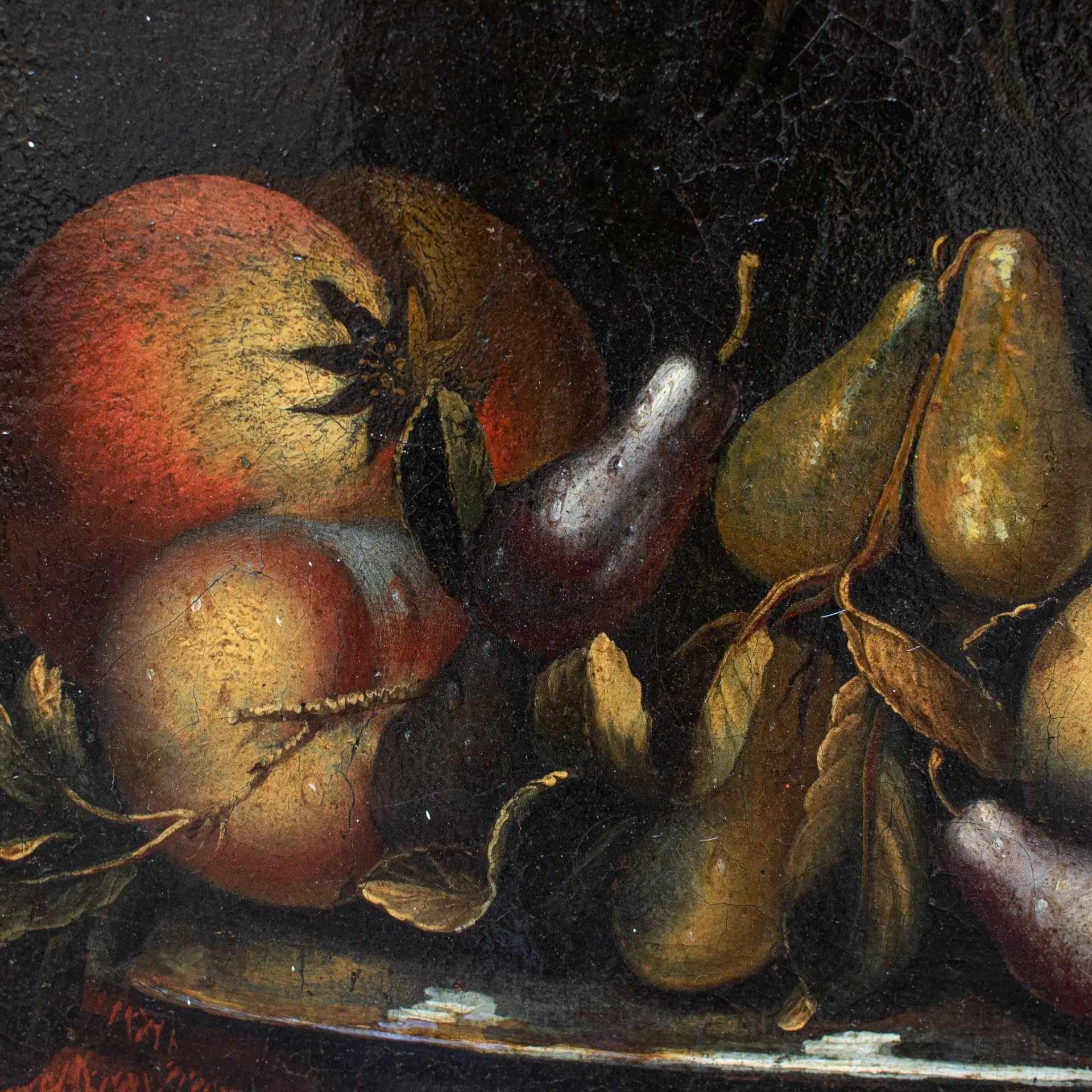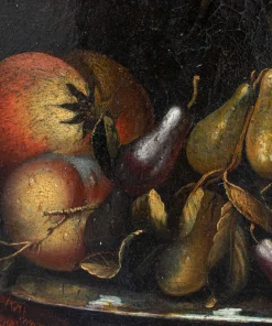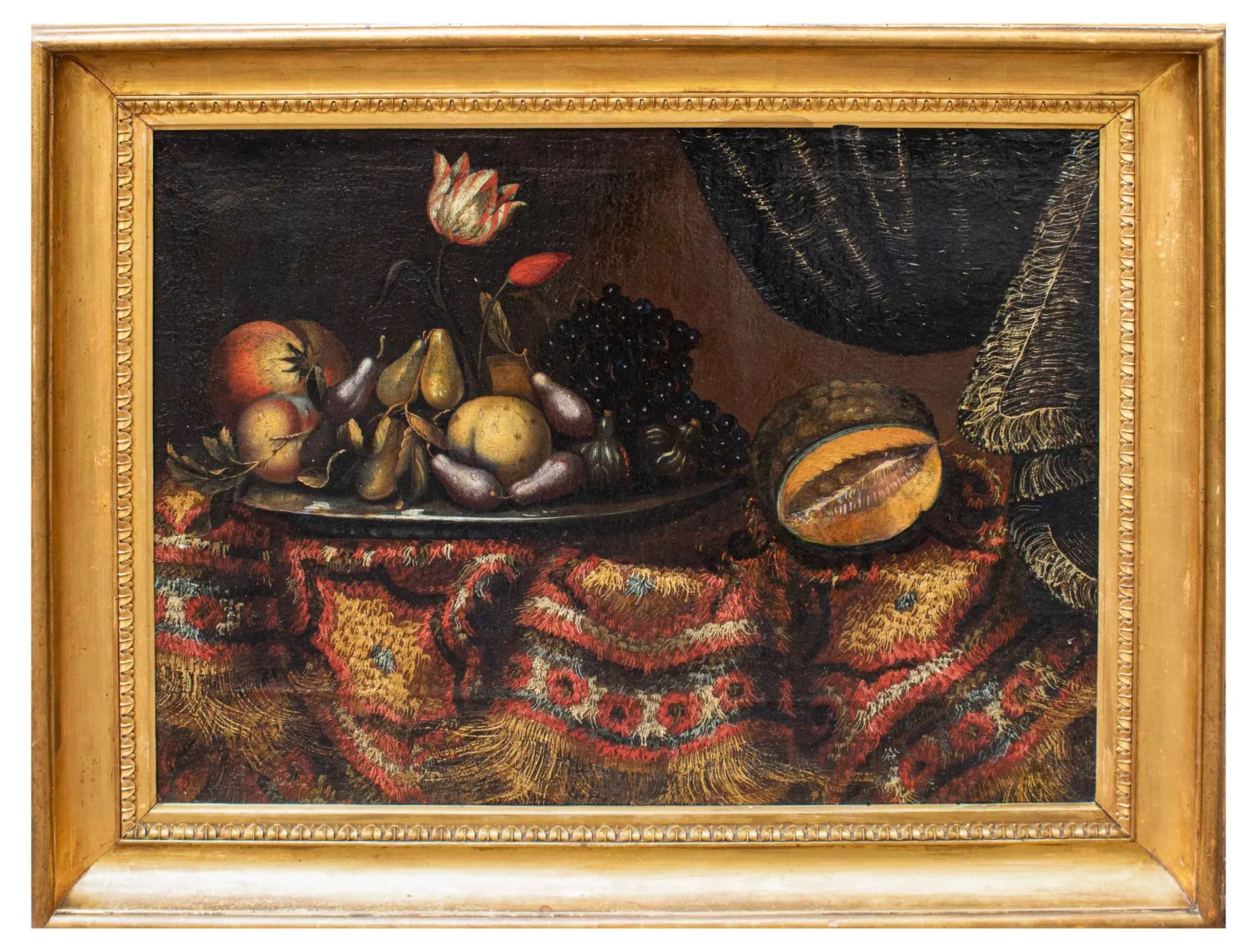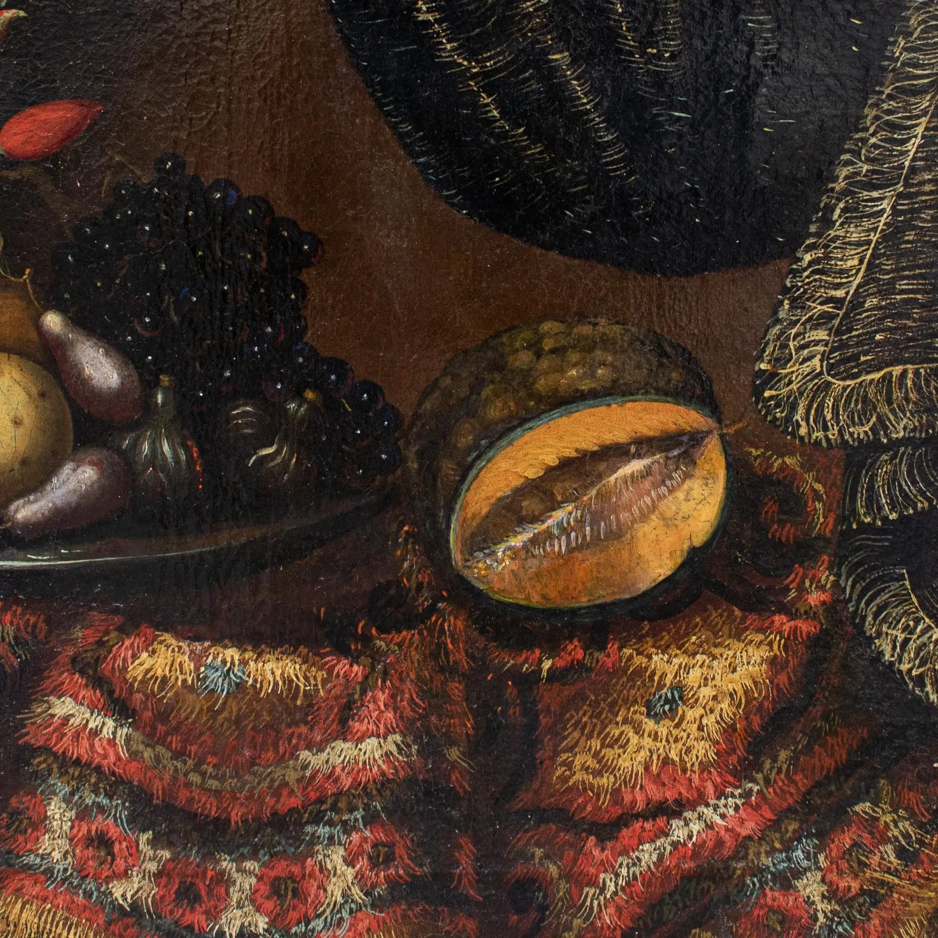 L’esuberanza dei colori sgargianti del tappeto, utilizzato quale preziosa tavola per il piatto argenteo base dell’ordinata serie di profumati frutti maturi, collima con la consistenza del tendaggio raccolto sull’angolo destro del dipinto. La minuziosità con cui l’artista ha saputo rendere l’interminabile susseguirsi di punti, nodi e frange del tappeto consente di ricondurne l’identità alla scuola di un pioniere del naturamorfismo impreziosito da questa specie di tessuti, ovvero francesco Noletti detto il Maltese.