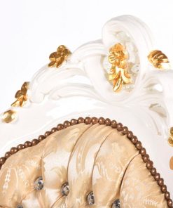 Dormeuse da camera o salotto, in stile barocco, richiama inevitabilmente il design ottocentesco, per il gusto sofisticato e i dettagli espressi dalla struttura color bianco, con intarsi color oro, e dal tessuto oro che riveste la seduta e lo schienale, il quale possiede piccoli punti luce in funzione delle gemme incastonate su di esso.