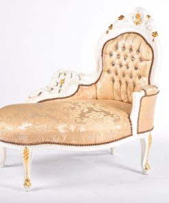 Dormeuse da camera o salotto, in stile barocco, richiama inevitabilmente il design ottocentesco, per il gusto sofisticato e i dettagli espressi dalla struttura color bianco, con intarsi color oro, e dal tessuto oro che riveste la seduta e lo schienale, il quale possiede piccoli punti luce in funzione delle gemme incastonate su di esso.
