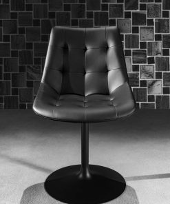 Distinta e superba sedia design caratterizzata da una struttura girevole con unica gamba centrale realizzata in acciaio verniciato. La scocca si presenta ampia e imbottita con rivestimento in ecopelle arricchito da trapuntatura. Disponibile nei colori bianco o nero.