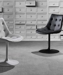 Distinta e superba sedia design caratterizzata da una struttura girevole con unica gamba centrale realizzata in acciaio verniciato. La scocca si presenta ampia e imbottita con rivestimento in ecopelle arricchito da trapuntatura. Disponibile nei colori bianco o nero.