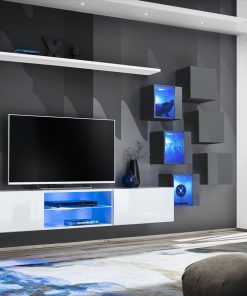 Parete attrezzata Chiarina costituita da 8 elementi sospesi come base porta tv, cubi e mensola. Moderna e pratica, la parete soggiorno Chiarina è disponibile in numerose varianti, con alternanza di colori bianco, grigio, nero e quercia natura.