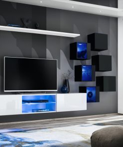 Parete attrezzata Chiarina costituita da 8 elementi sospesi come base porta tv, cubi e mensola. Moderna e pratica, la parete soggiorno Chiarina è disponibile in numerose varianti, con alternanza di colori bianco, grigio, nero e quercia natura.