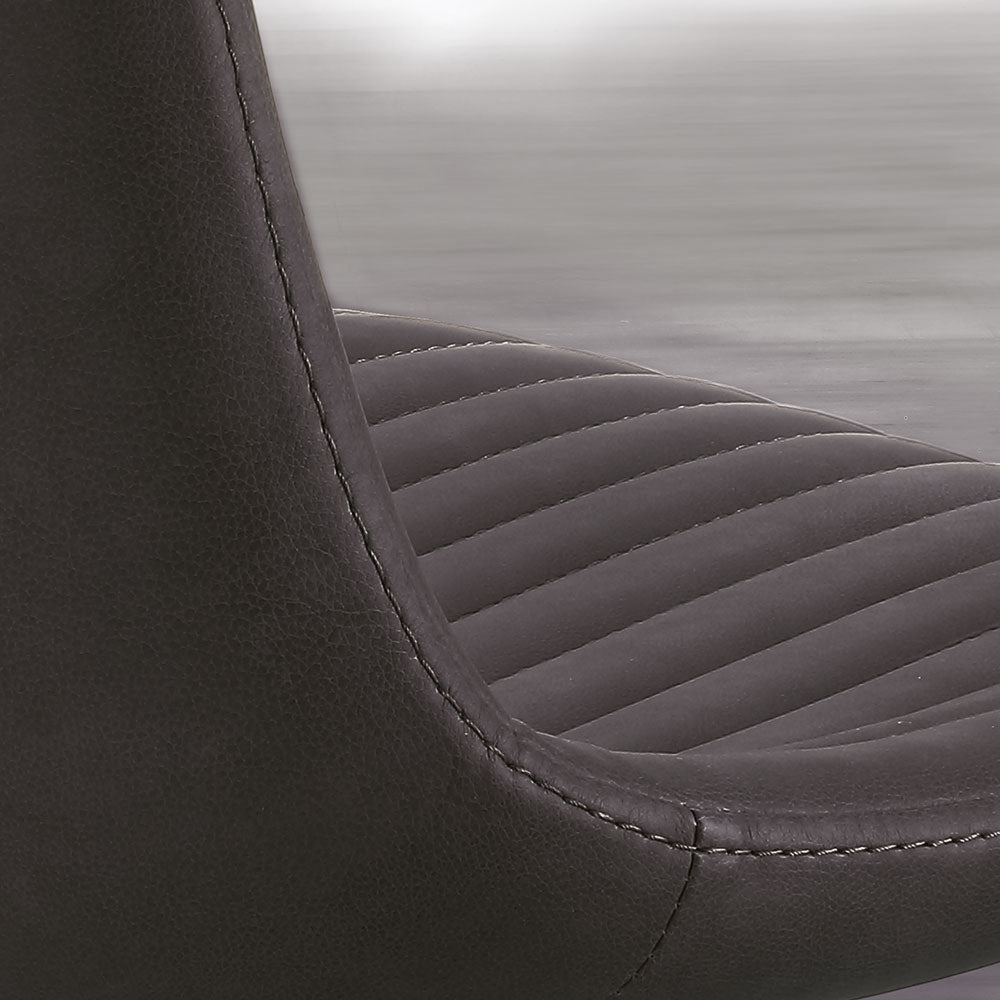 Sedia Cinquecento dal design contemporaneo, caratterizzata da scocca rivestita in ecopelle con cuciture verticali, e struttura in metallo colore nero.