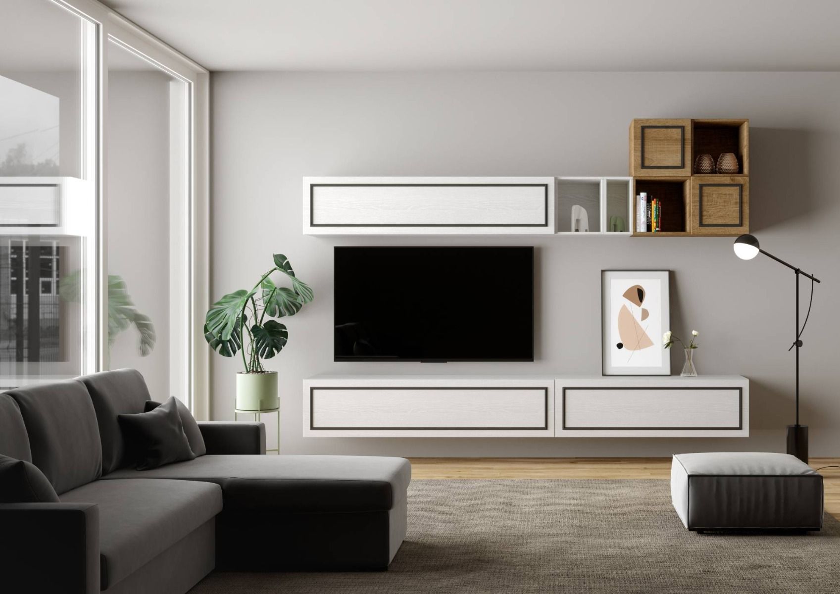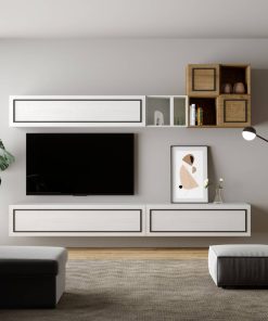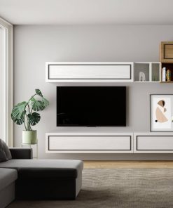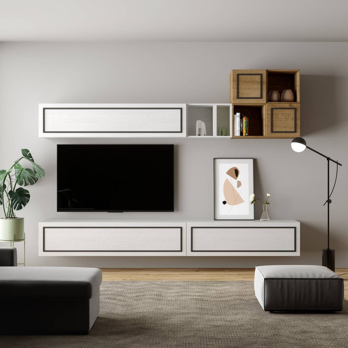 Parete moderna attrezzata Clarenza Evo realizzata interamente in legno e distinta dalla presenza di pensili orizzontali in legno bianco frassino accompagnati da vani e cubi sia bianco che quercia. La nostra parete living rappresenta un esempio di soluzione componibile altamente versatile, funzionale con un’estetica fortemente minimale. Sono da evidenziare le cornicette colore antracite che accompagnano i frontali dei pensili, elemento innovativo e che marca la linearità e la geometria del design.