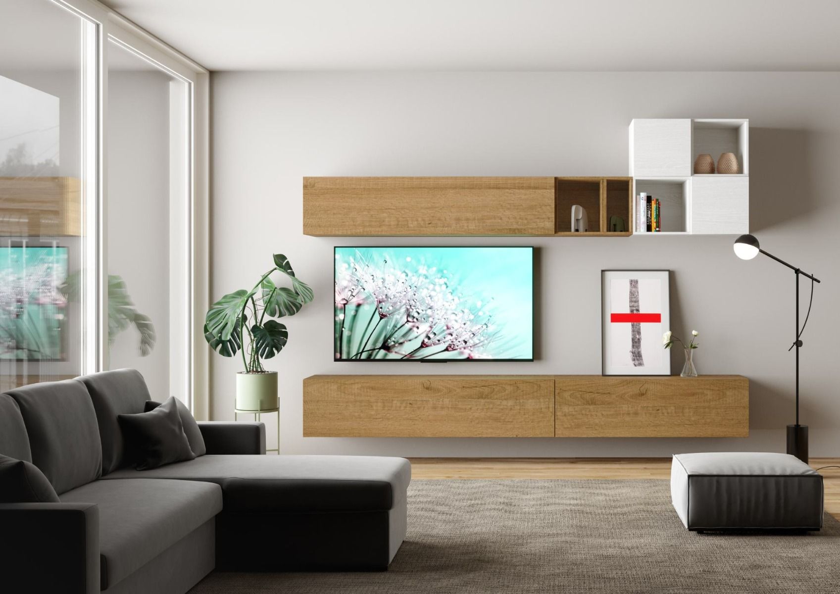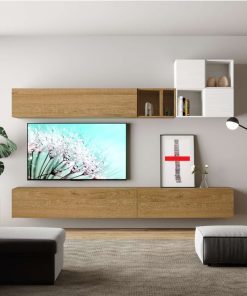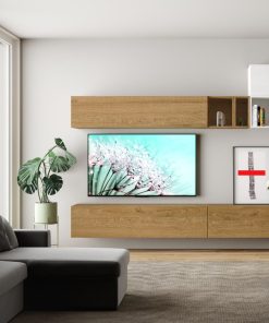 Parete dal design moderno modello Clarenza una soluzione sobria esteticamente ma funzionale per arredare il tuo living. Clarenza è composta da pensili e vani a giorno. realizzati in legno bianco frassino e quercia.
