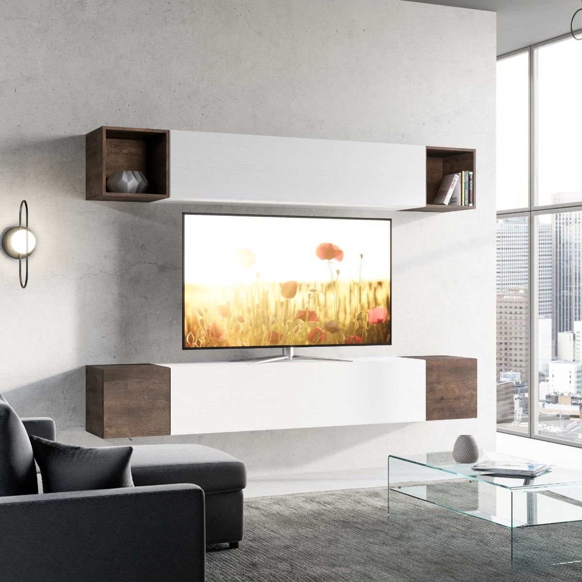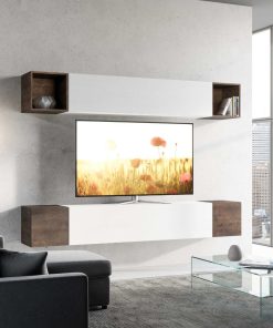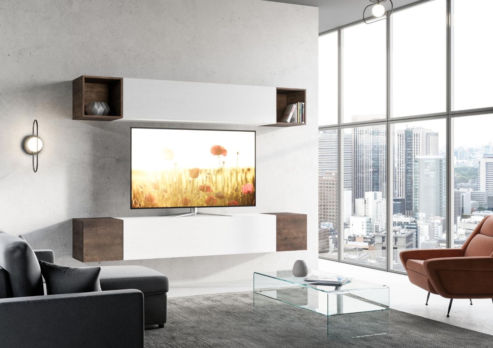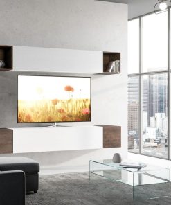 Parete attrezzata moderna Claretta composta da 6 elementi sospesi, con pensili orizzontali, cubi e vani, realizzati in legno in due bellissime finiture ovvero bianco frassino e noce. La combinazione permette di avere un ambiente aeroso e luminoso. La qualità del legno e i meccanismi di apertura touch screen coccoleranno le tue giornate. VIvi la tua quotidianità con le pareti attrezzate di CollyShop che da oggi ti offre la possibilità di personalizzare la combinazione dei pensili: lasciati ispirare e crea il design del tuo salotto.