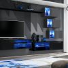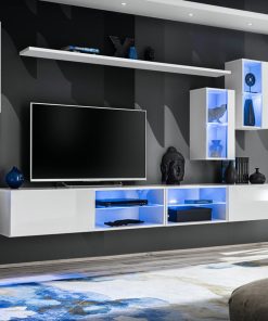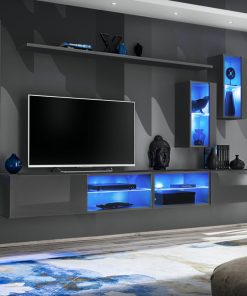 Parete attrezzata componibile costituita da 7 elementi tutti sospesi: 2 basi porta tv, mensola, 2 pensili verticali e 2 vetrinette, arricchita da luci a led. Coletta è esempio di design ultra moderno, acquistabile nei colori: bianco, antracite, nero con frontali lucidi, oppure interamente quercia natura.