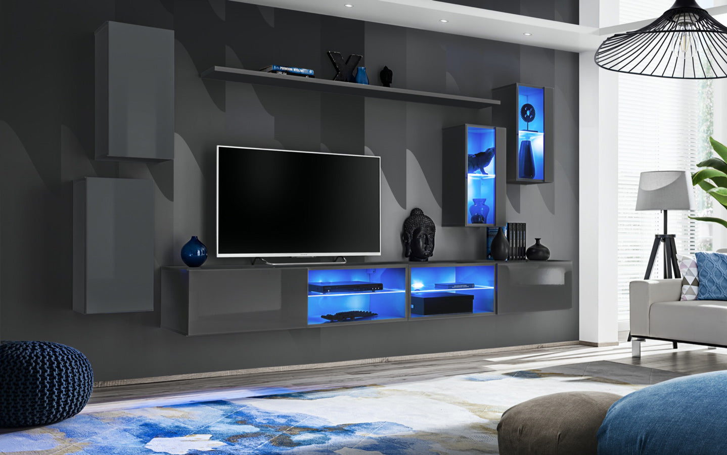 Parete da salotto Coletta, un modello definito da volumi semplici che si alternano per creare una composizione geometrica equilibrata. Infatti, Coletta dispone di 2 basi porta tv sospese, pensili verticali, mensola e vetrinette che potrai collocare a parete come desideri, seguendo un ritmo dinamico oppure ordinato, ma soprattutto, sfruttando i vani interni di ogni elemento. Le luci a led colore blu aggiungono particolarità a questa parete soggiorno e potrai scegliere tra 4 versioni: bianco, antracite, nero o quercia natura.