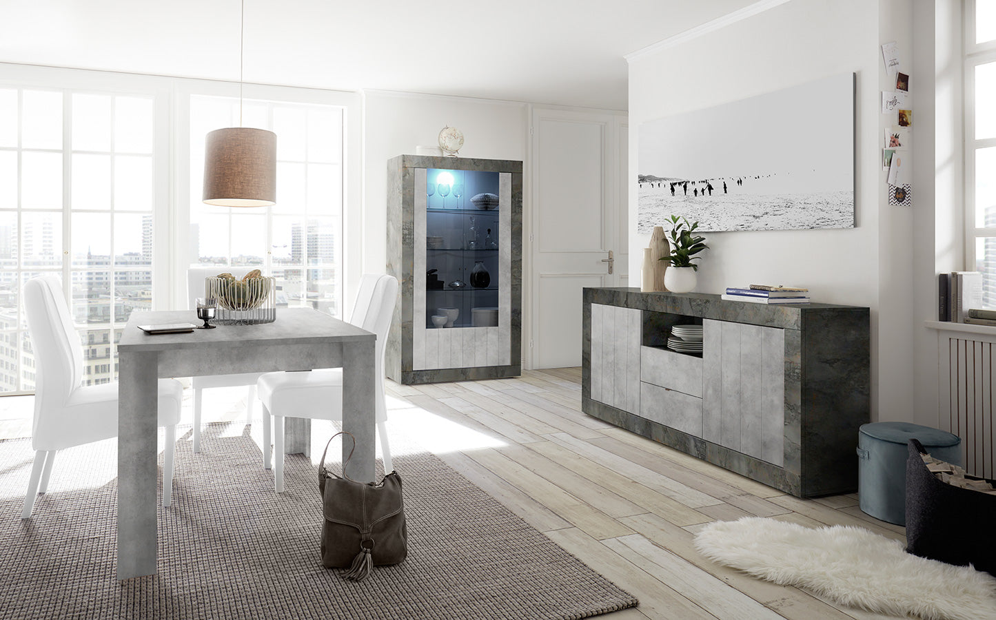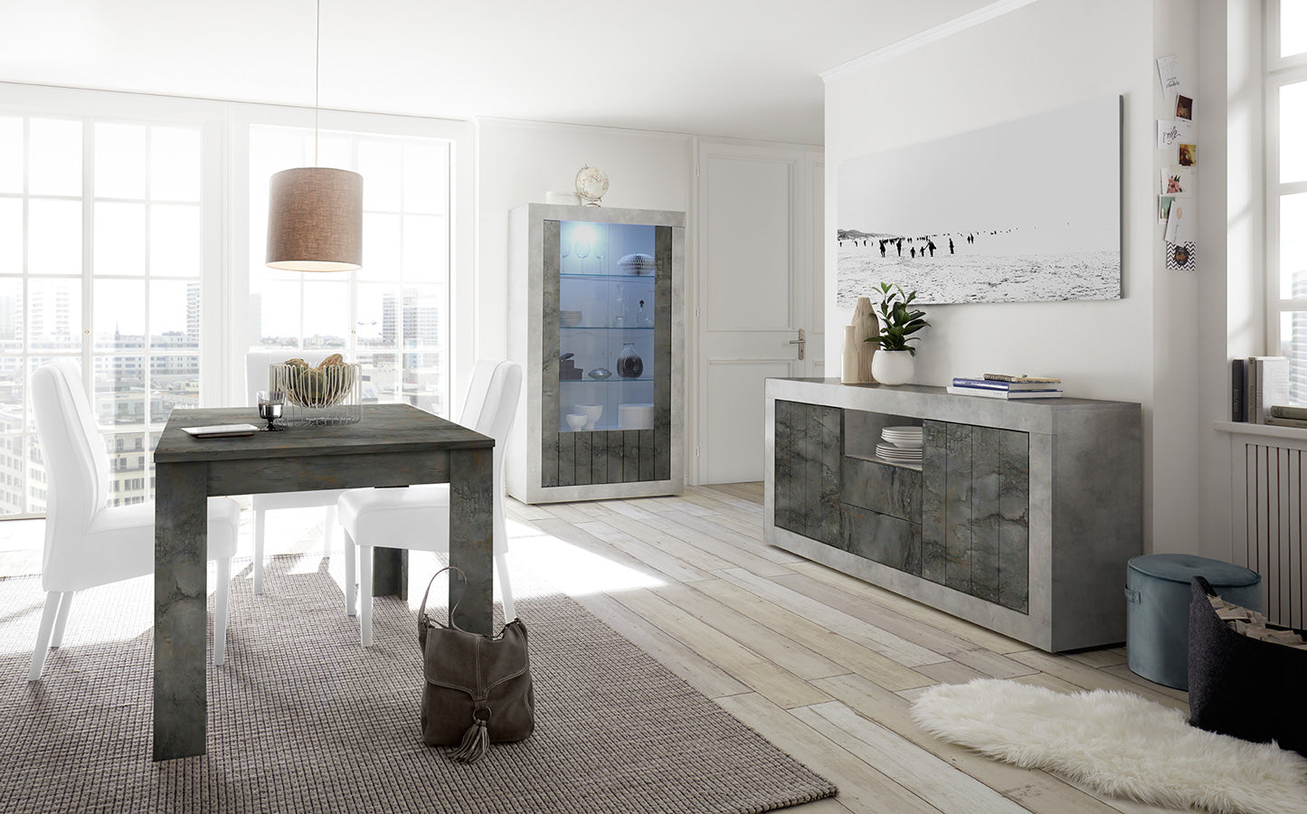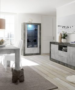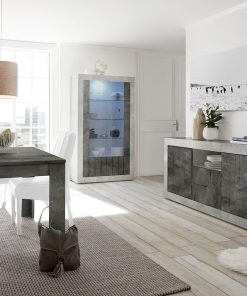Sala da pranzo dal design moderno Columbia, composta da vetrina alta, madia con ante e cassetti e tavolo allungabile da pranzo da cm 137 a cm 185. Il nostro soggiorno piacerà a chi cerca un arredamento contemporaneo ed alternativo, con finiture innovative come cemento e ossido. Il mobili del set sono tutti Made in Italy, sicuri ed affidabili per robustezza e solidità.
