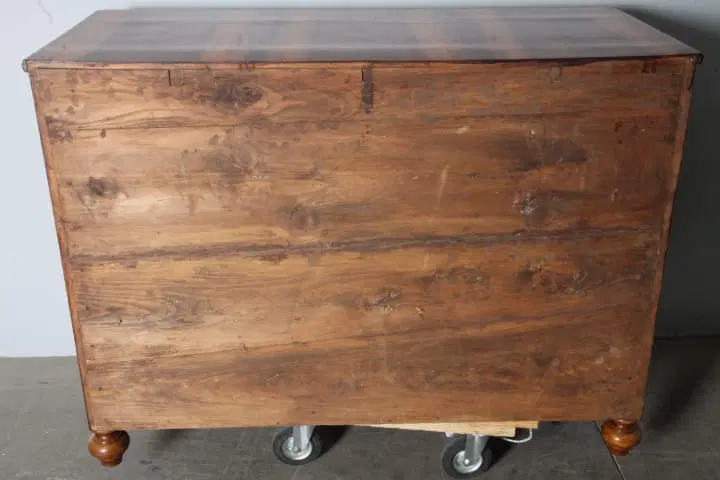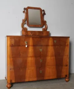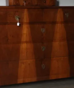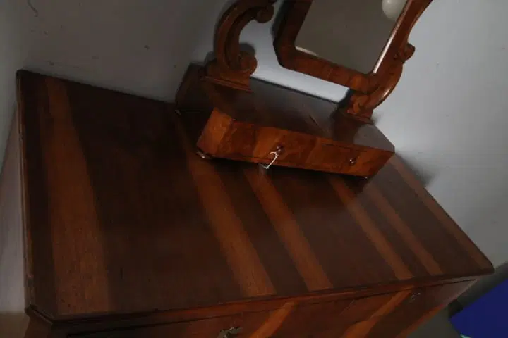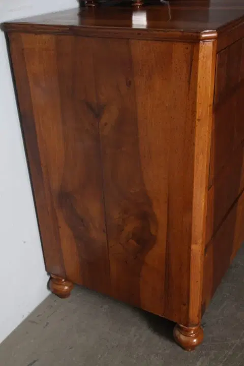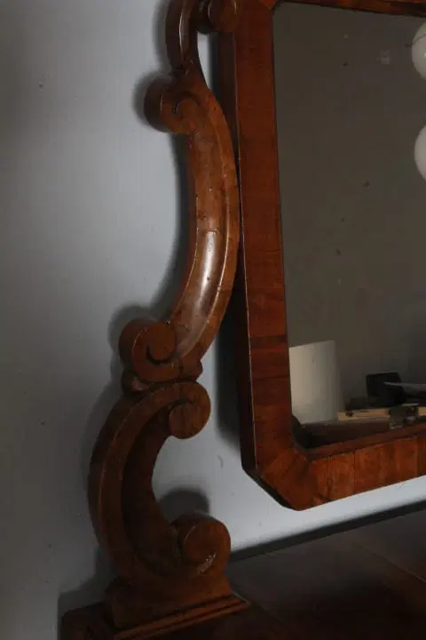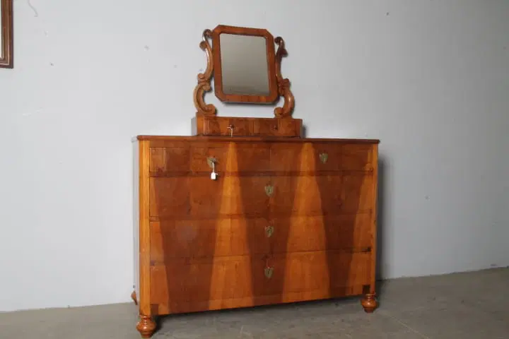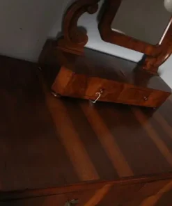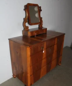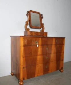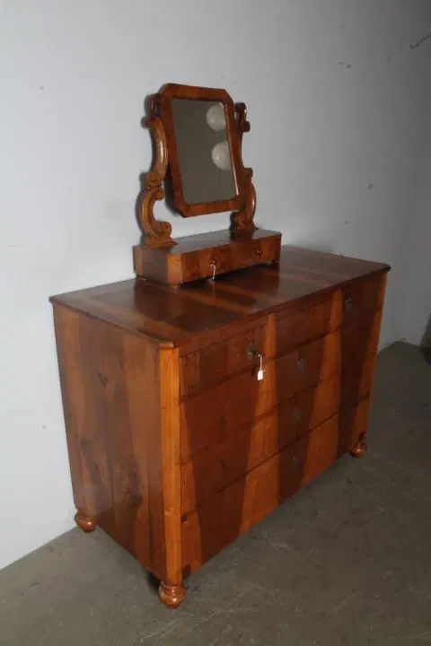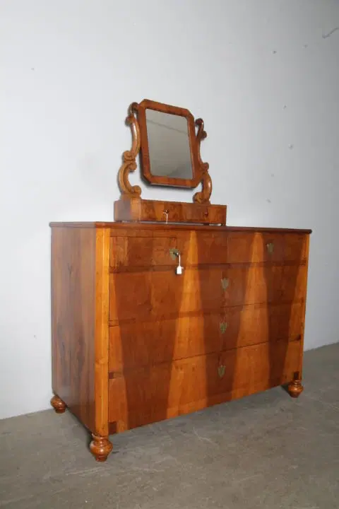 Antico bellissimo cassettone toscano in noce epoca del Luigi Filippo, 1850 circa, a tre cassetti più due piccoli superiori, struttura in noce massello e cassetti lastronati. Sul piano conserva la sua splendida Toletta, specchierina da appoggio con vetro basculante. Completamente restaurato e finiti a cera d’api, serrature e incastri coevi.