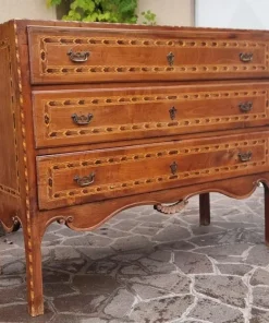 Il comò si distingue per la sua combinazione di materiali di alta qualità. Il legno di noce, robusto e durevole, offre una base solida, mentre gli intarsi in ciliegio aggiungono un tocco di raffinatezza e calore al mobile. Le proporzioni eleganti, con una larghezza di 131 cm, una profondità di 55 cm e un’altezza di 106 cm, lo rendono un pezzo versatile, perfetto per qualsiasi ambiente, dalla camera da letto al soggiorno. Questo mobile non solo è esteticamente attraente, ma offre anche un’ampia capacità di contenimento grazie ai suoi spaziosi cassetti.