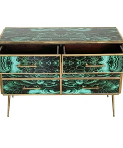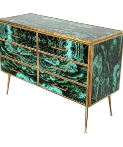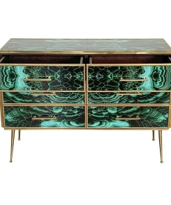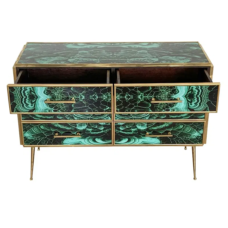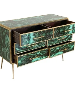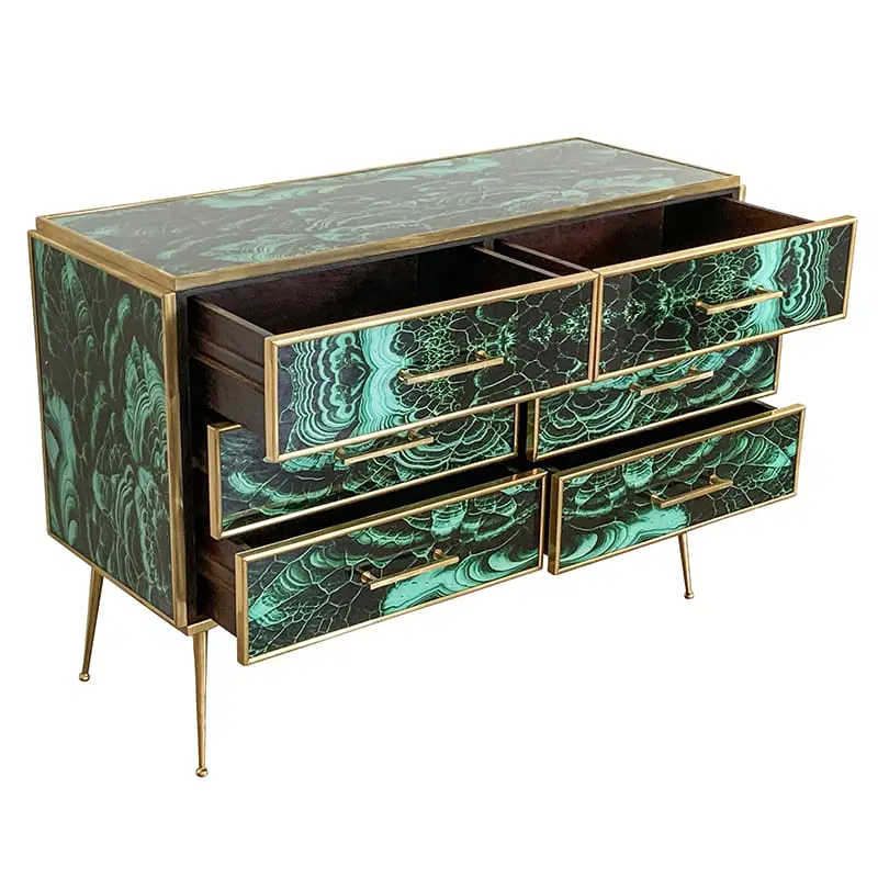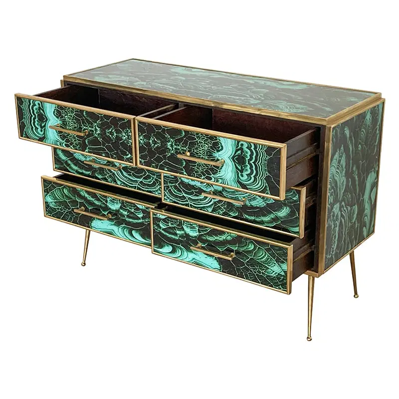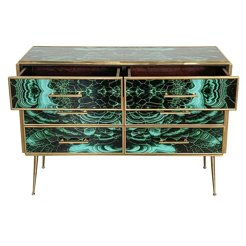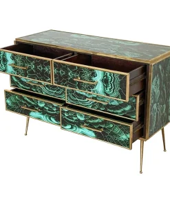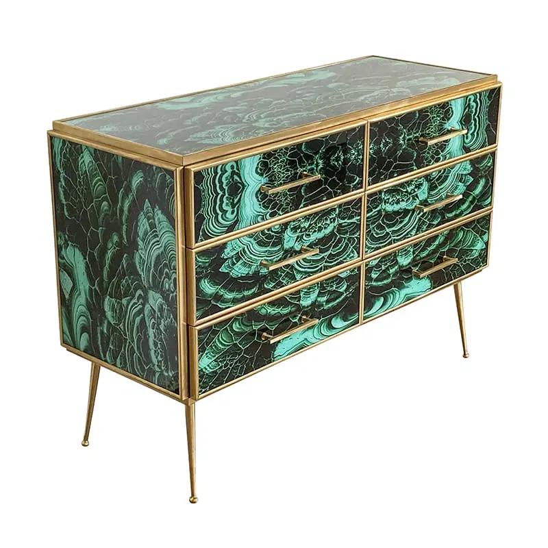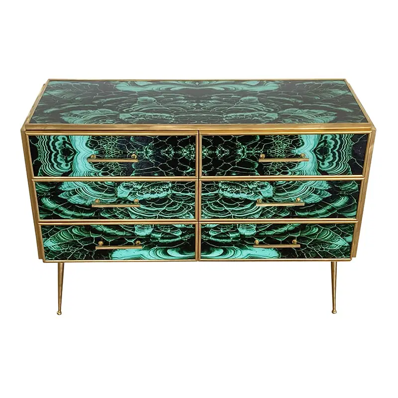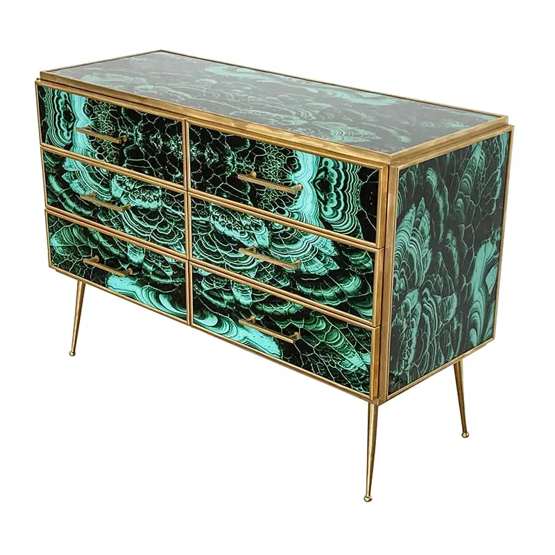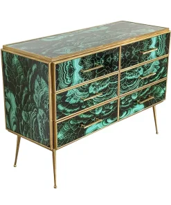 Comò in legno rivestito in vetro color malachite – sei cassetti – profili maniglie piedini in ottone