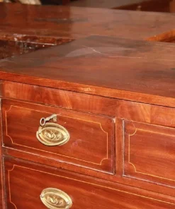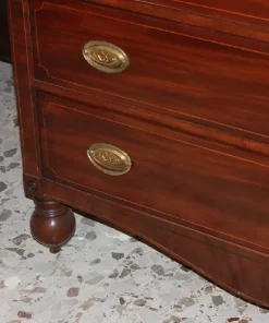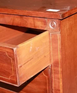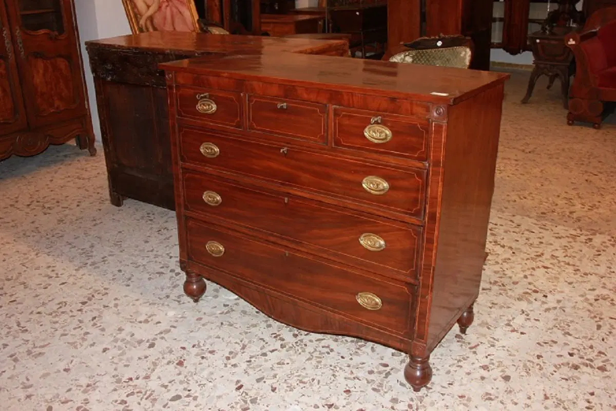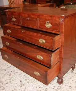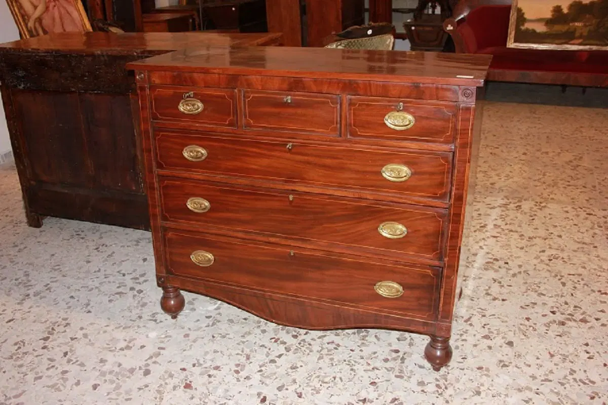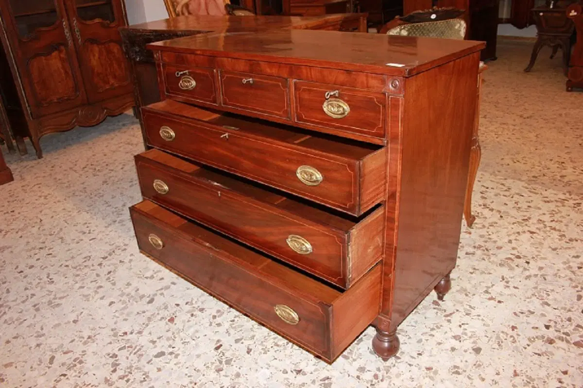 Comò inglese della prima metà del 1800, stile Regency, in legno di mogano. Presenta 3 cassettini sottopiano, 3 grandi cassetti impreziositi da filetto di intarsio e maniglie in bronzo con tritoni.