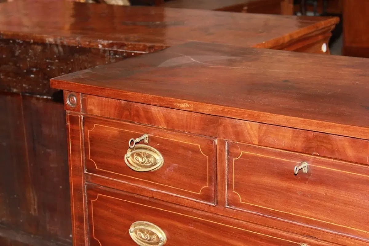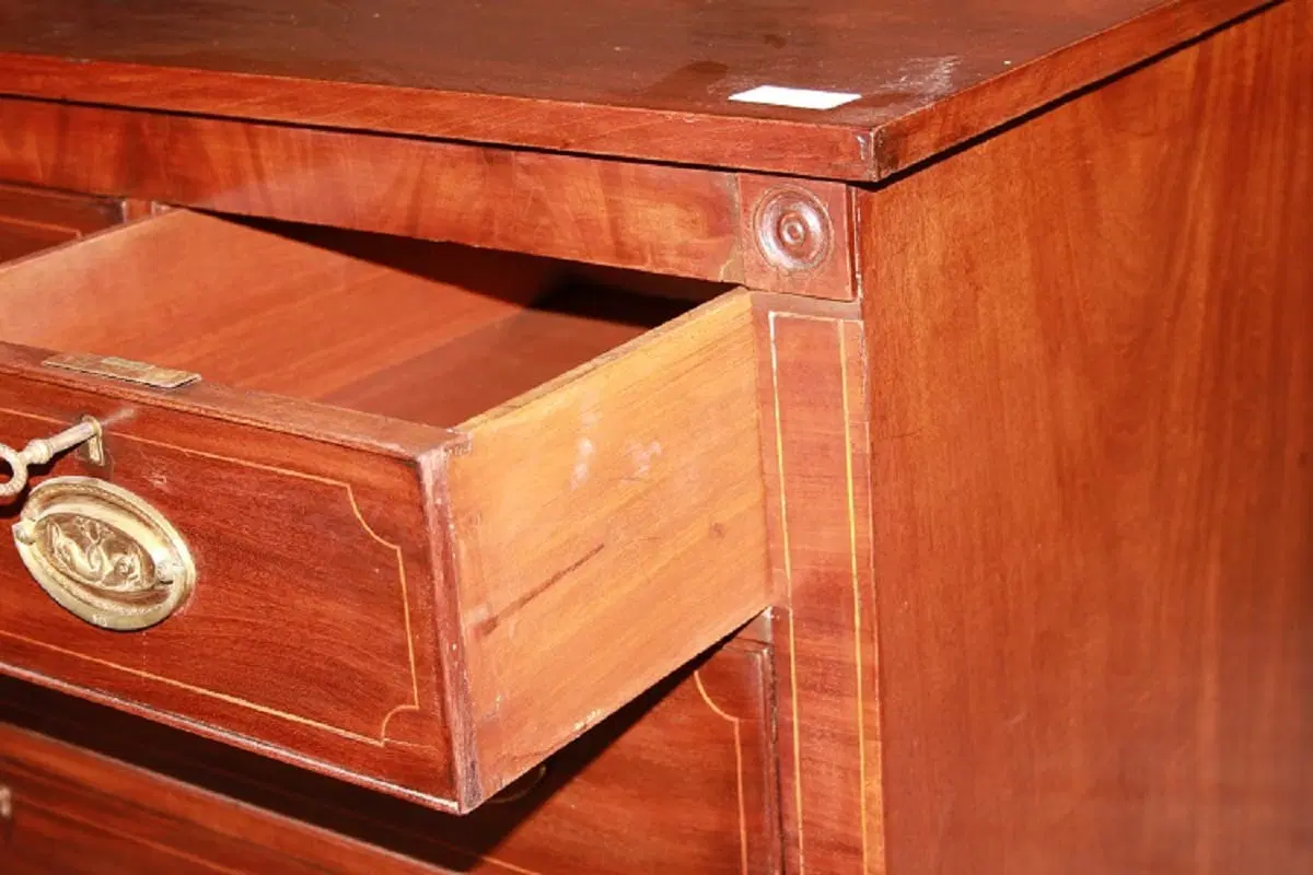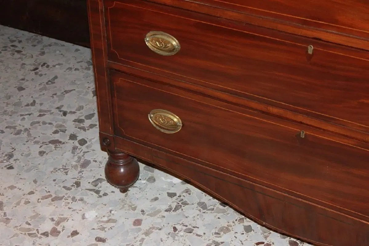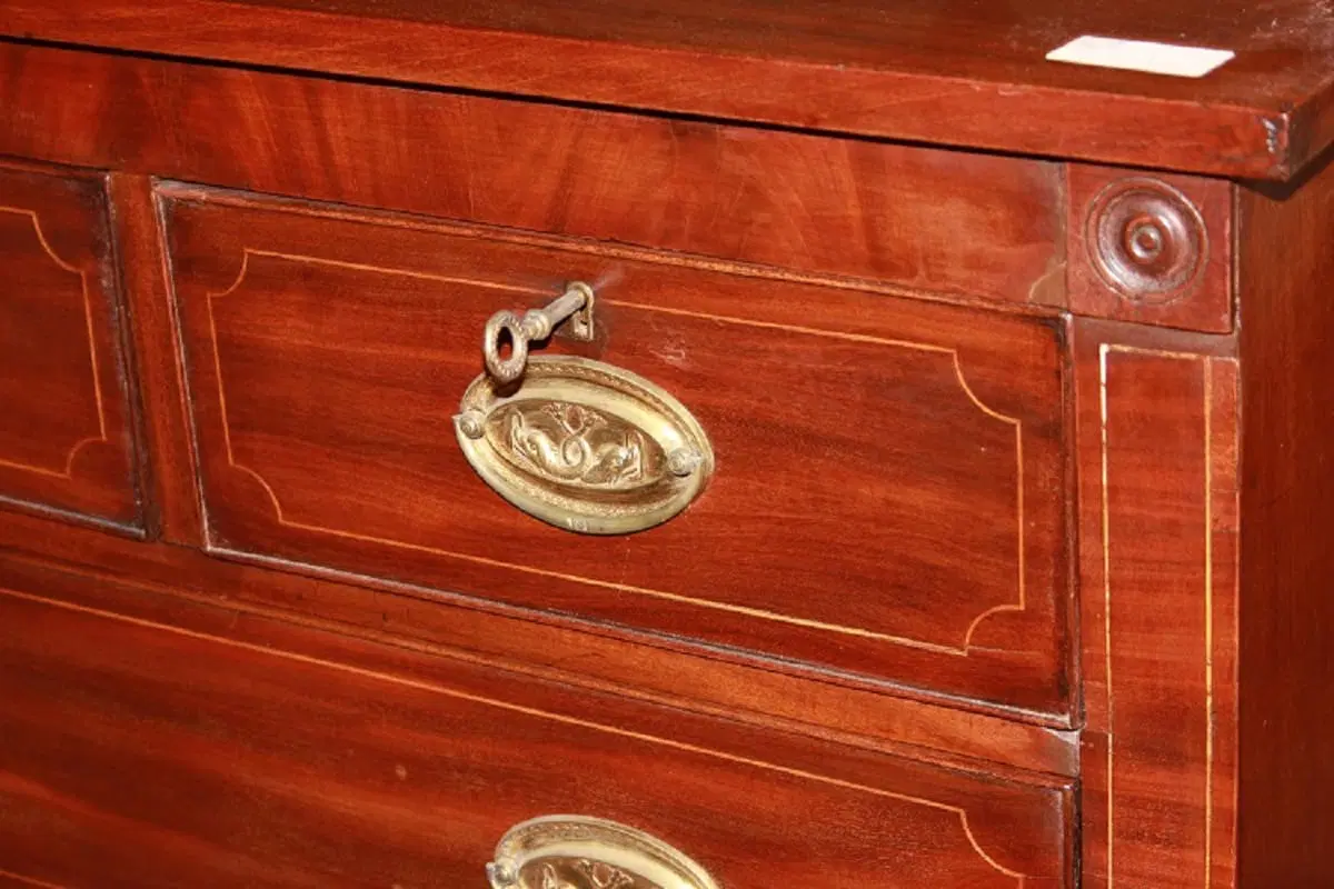 Comò inglese della prima metà del 1800, stile Regency, in legno di mogano. Presenta 3 cassettini sottopiano, 3 grandi cassetti impreziositi da filetto di intarsio e maniglie in bronzo con tritoni.