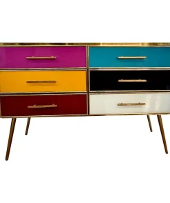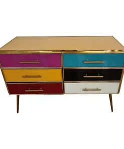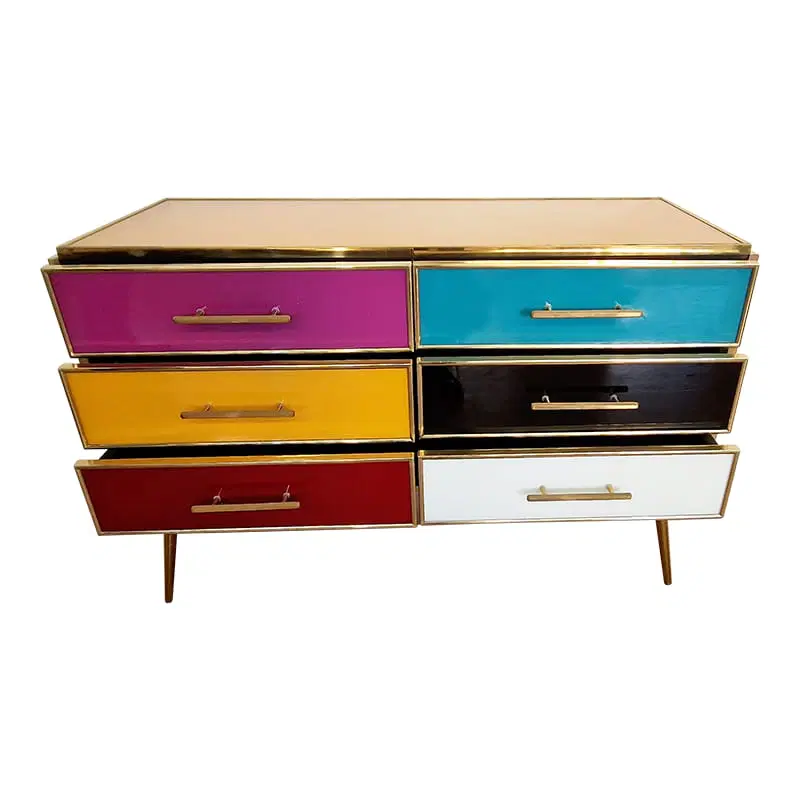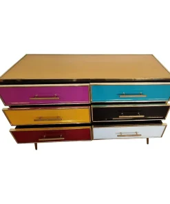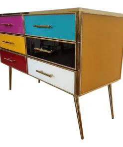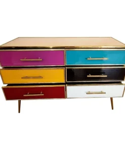 Comò 6 cassetti, interamente realizzato a mano, con struttura in legno, ricoperto in vetro giallo e cassetti multicolore; profili e piedi in ottone dorato.