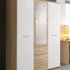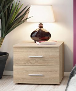 Comodino in legno con due cassetti, pensato per essere universale, con un design moderno, semplice e finiture sempre utilizzate come bianco opaco e quercia natura.