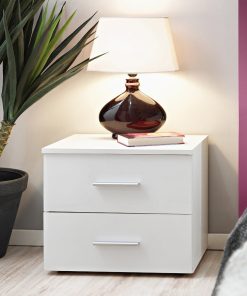 Comodino in legno con due cassetti, pensato per essere universale, con un design moderno, semplice e finiture sempre utilizzate come bianco opaco e quercia natura.