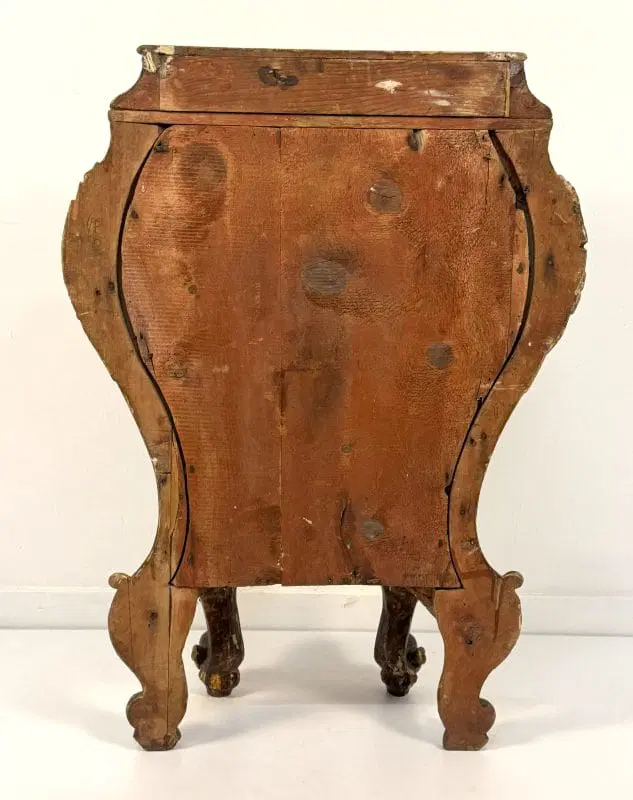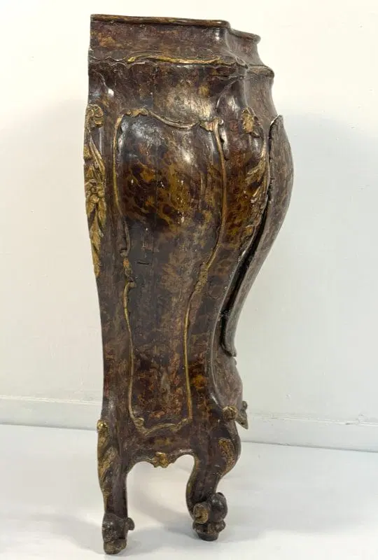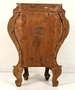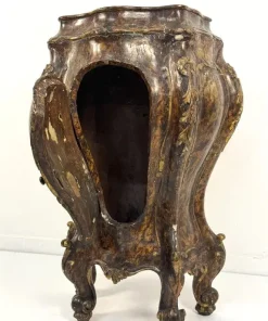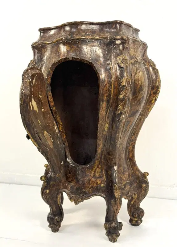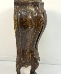 Comodino in legno laccato, Venezia, XIX secolo, corpo fortemente sagomato interamente decorato a simulare un effetto tartarugato, sul fronte un’anta e sugli angoli decori a rilievo dorati a piccoli tralci con fiori e foglie ed elementi rocailles, piedi mossi terminanti a ricciolo, cm 87x 61.5 x 33