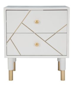 Comodino con 2 cassetti da design moderno, realizzato in legno colore bianco e arricchito da inserti in metallo dorato, come sono colore oro anche i piedini e i pomelli.