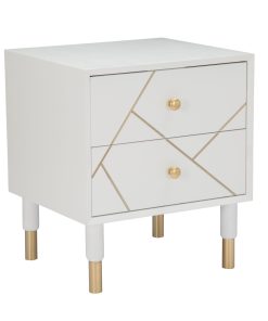 Comodino con 2 cassetti da design moderno, realizzato in legno colore bianco e arricchito da inserti in metallo dorato, come sono colore oro anche i piedini e i pomelli.
