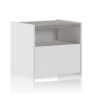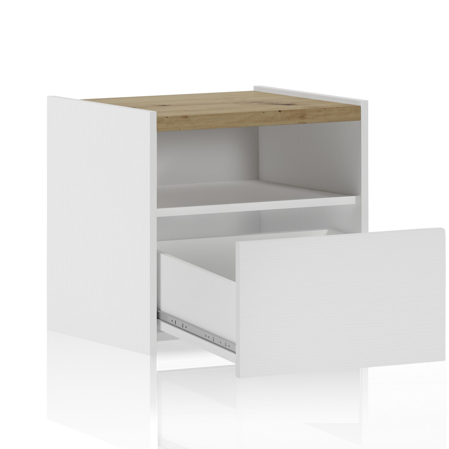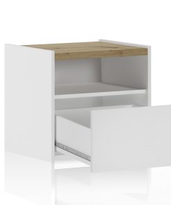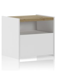 Pratico e versatile comodino da camera dal design lineare e moderno, realizzato in legno con struttura larice bianco a poro aperto e top colore rovere. Il nostro comodino è strutturato con comodo cassetto e vano, facile da abbinare con il tuo letto moderno in legno bianco o naturale.
