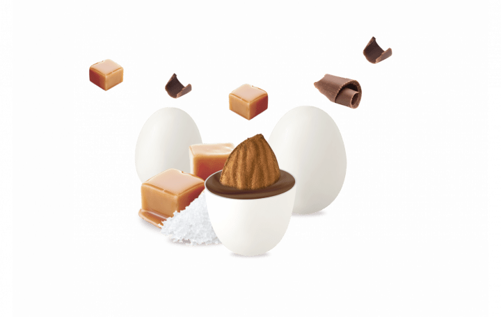 Mandorla tostata ricoperta da cioccolato al latte al gusto di caramello e sale e da un sottile strato di zucchero.