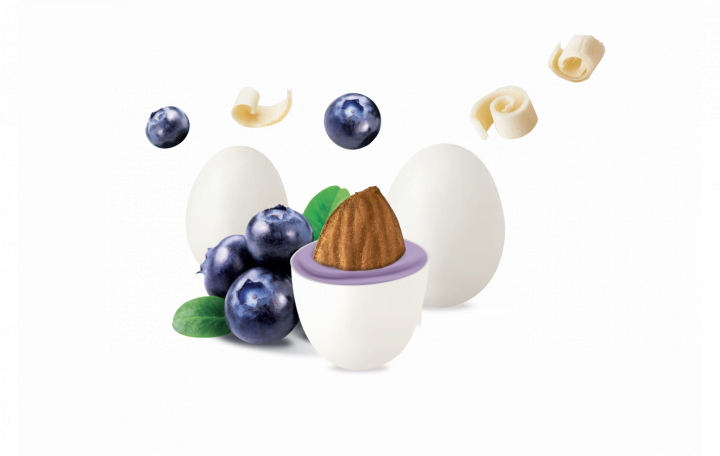 Mandorla tostata ricoperta da cioccolato bianco al gusto di mirtillo e da un sottile strato di zucchero.