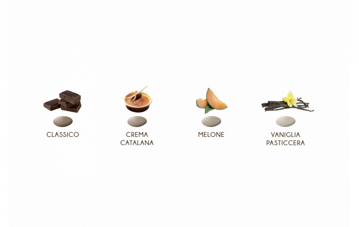 Mandorla tostata ricoperta da uno strato di cioccolato bianco o fondente ai gusti assortiti (classico, crema catalana, melone e vaniglia pasticcera) e da un sottile strato di zucchero.