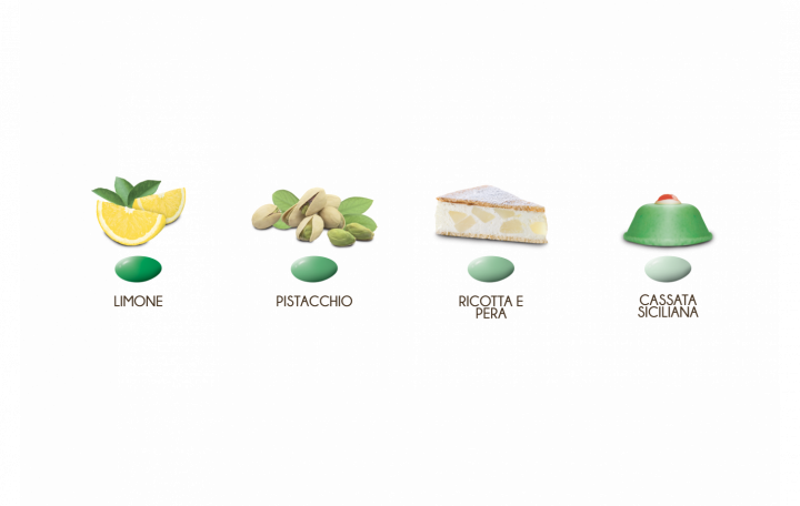 Mandorla tostata ricoperta da cioccolato bianco ai gusti assortiti (limone, pistacchio, ricotta e pera e cassata siciliana) e da un sottile strato di zucchero.