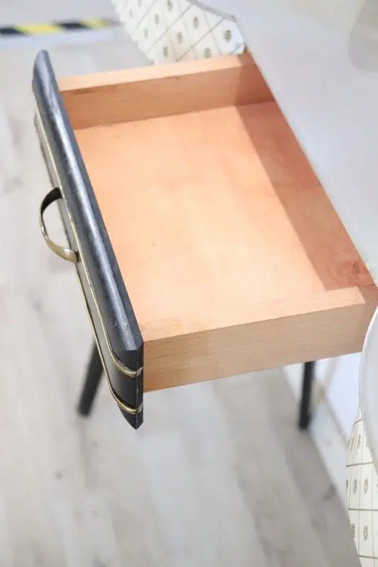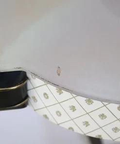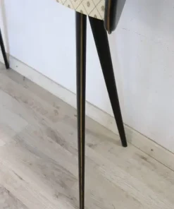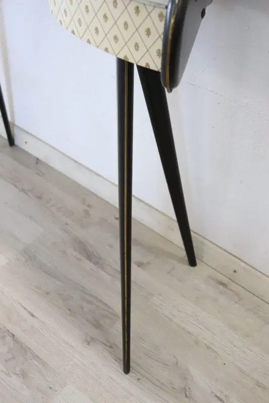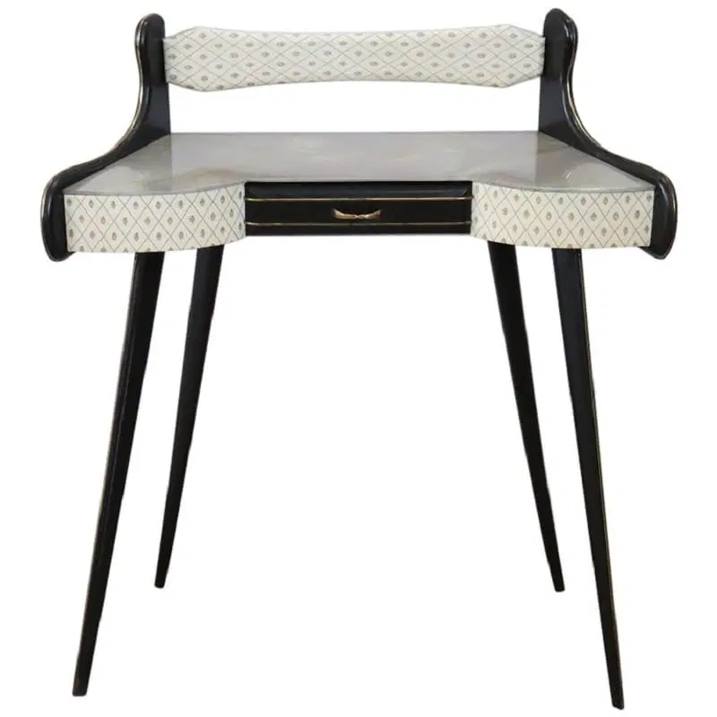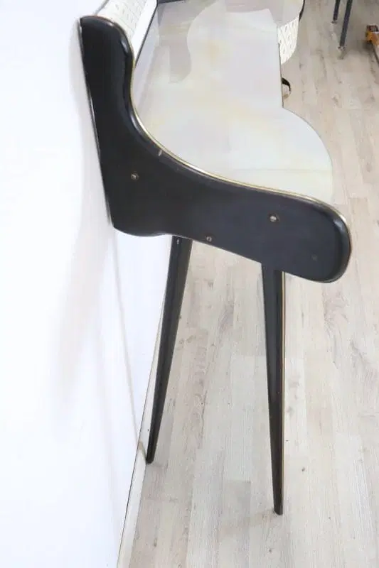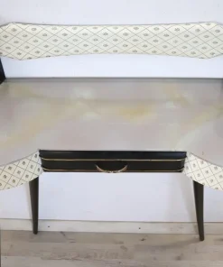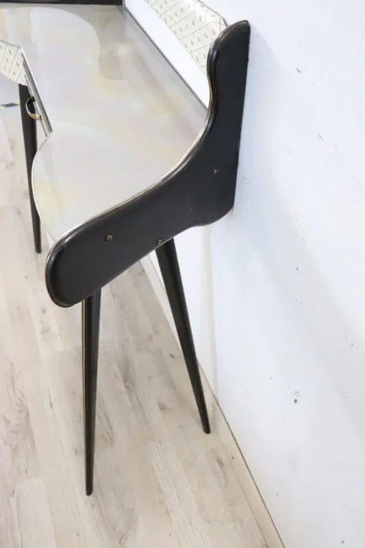 Particolare consolle vintage degli anni ’50. Realizzata in legno laccato nero con una linea mossa sul fronte. Dotata di un pratico cassetto. Il piano è in vetro decorato. Il fronte è rivestito in plastica con decorazione stampata. Deliziose decorazioni in ottone dorato mettono in risalto le parti laccate nere. Perfetta per un ambiente moderno. Si consiglia, ma non strettamente necessario, il fissaggio a parete per una maggiore stabilità. Piccoli segni di usura, guardare attentamente tutte le foto in dettaglio. Proposta ad un’ottimo prezzo trattabile vi invitiamo ad inviarci le vostre proposte di acquisto le valuteremo con piacere.