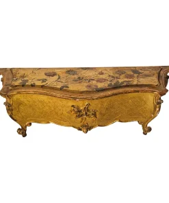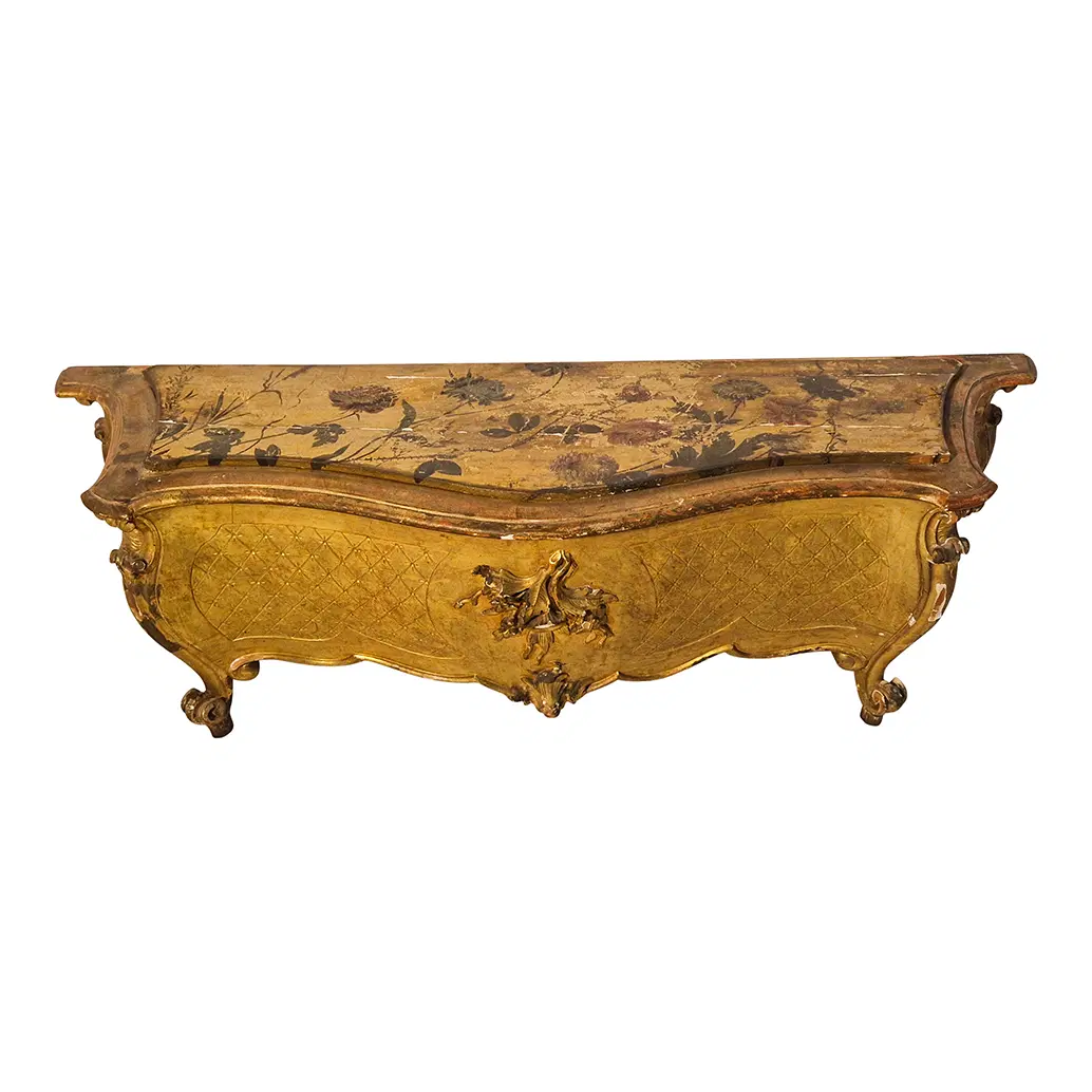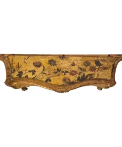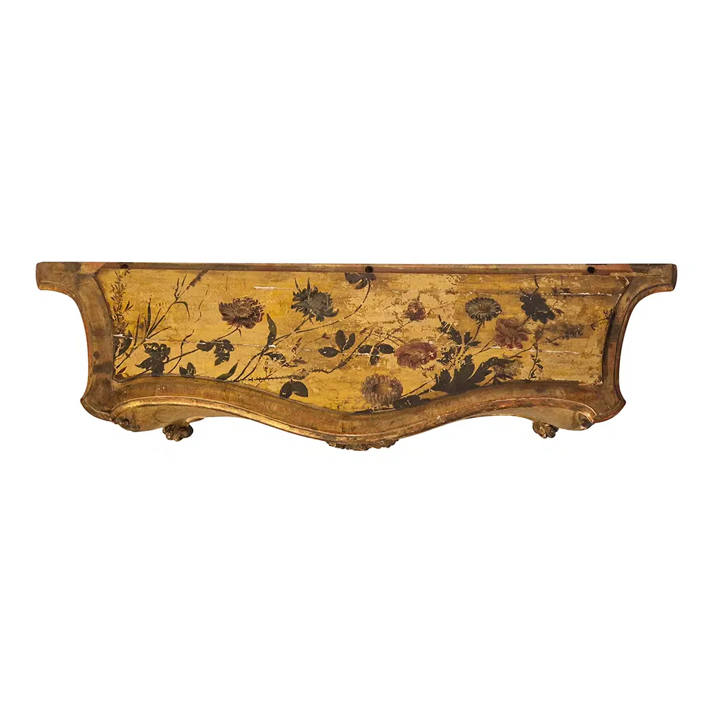 Elegante consolle bassa in stile francese, in legno dorato, fronte e fianchi mossi, parti scolpite con motivi floreali, gambe a virgola desinenti a ricciolo. Piano della consolle è finemente decorato con diversi fiori policromi e foglie dipinti a mano.