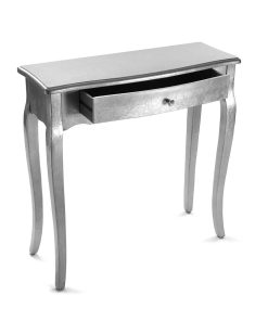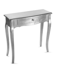 Consolle da ingresso, elegante e raffinata, in legno effetto foglia argento, con 1 cassetto centrale. Questa consolle, di stile nettamente classico, è in grado di arricchire la vostra casa con un elemento d’arredo intramontabile e stiloso. E’ perfetto per la zona giorno, ma originale in corridoi spaziosi, se abbinato con portafoto e complementi d’arredo eleganti; ideale nella zona notte, insieme a specchiera e poltroncina, per ritagliarsi un piccolo spazio per la cura personale.