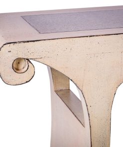 Tavolo consolle da ingresso o salotto realizzata in legno con lavorazioni e intarzi, colore beige.