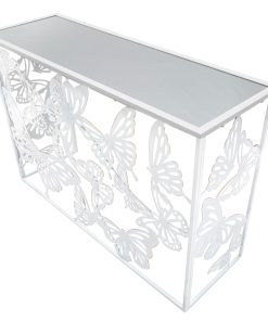 Consolle design realizzata in metallo, sintesi di eleganza e raffinatezza impareggiabile. Infatti, le vistose farfalle che decorano tutta la struttura esprimono una sensazione di leggerezza e delicatezza. La scelta del colore bianco e soprattutto il bellissimo piano con specchio, si rivelano la scelta ottimale per arredare con gusto ricercato il tuo ingresso, da abbinare con una poltrona, pouf , uno specchio o pannello decorativo per creare un angolo ricco di fascino.