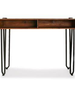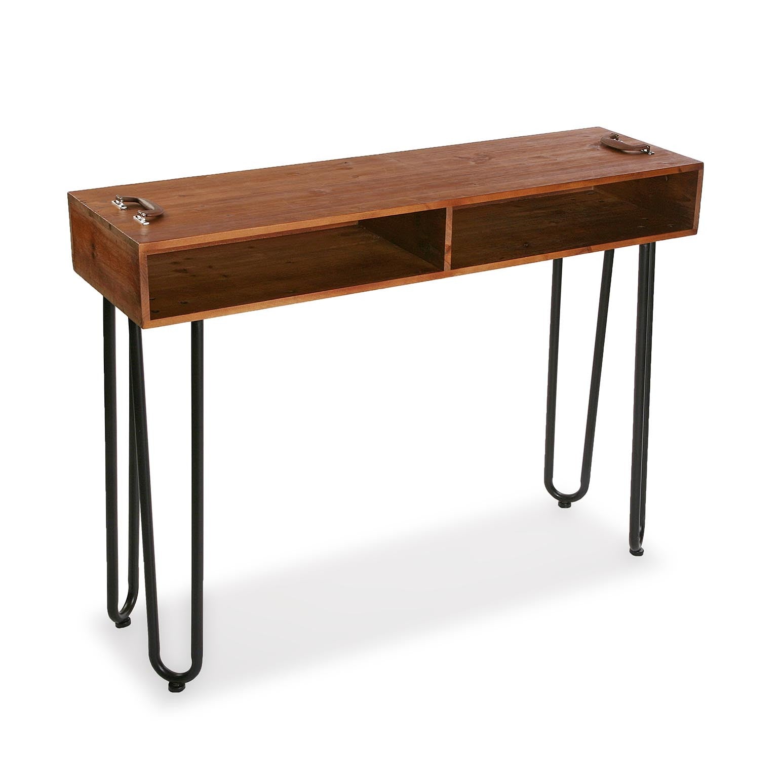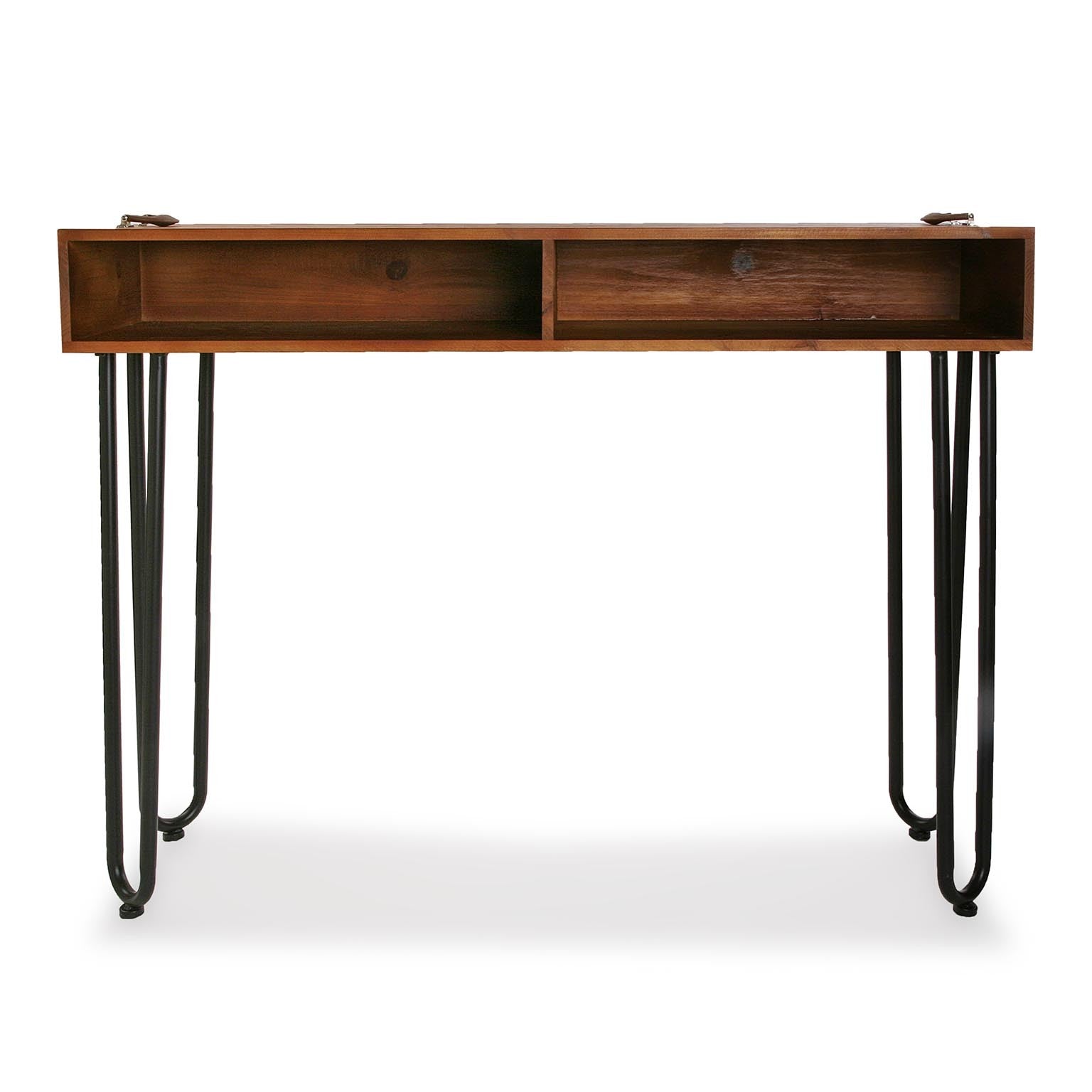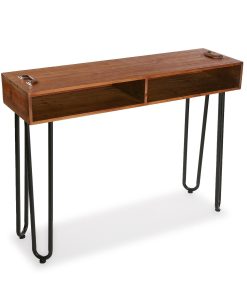 Consolle da ingresso realizzata in metallo e legno, presenta 2 vani a giorno molto utili e pratici, utilizzabili anche come porta riviste. Le gambe in metallo curvato unite al legno del piano, sono peculiarità dello stile industrial.