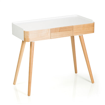 Consolle da ingresso con due cassetti, un modello dal design moderno con dettagli singolari che ricordano il vintage, formata da una struttura con angoli stondati. Anche l’abbinamento di colori e finiture contribuiscono ad aumentare la particolarità di questo mobiletto di ingresso, infatti le gambe ed i cassetti si presentano il legno finitura naturale, mentre la struttura, è di colore bianco.
