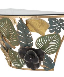 Consolle moderna sospesa realizzata in metallo dalla forma semicircolare e dallo stile trionfo di eleganza a fantasia. infatti, questo mobiletto da ingresso sfoggia una struttura dorata decorata con fiori e foglie accuratamente lavorate per conferire un aspetto più realistico e verniciate con colori armonici, il tutto accompagnato dal piano in vetro trasparente con lo scopo di esaltare la raffinatezza di questo complemento e dell’intero arredo del tuo ingresso.