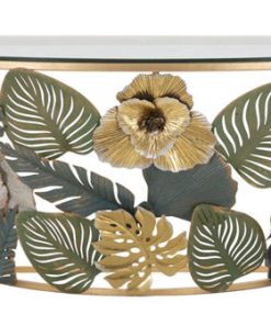 Consolle moderna sospesa realizzata in metallo dalla forma semicircolare e dallo stile trionfo di eleganza a fantasia. infatti, questo mobiletto da ingresso sfoggia una struttura dorata decorata con fiori e foglie accuratamente lavorate per conferire un aspetto più realistico e verniciate con colori armonici, il tutto accompagnato dal piano in vetro trasparente con lo scopo di esaltare la raffinatezza di questo complemento e dell’intero arredo del tuo ingresso.